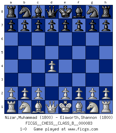Last move : 1-0 2009 October 1 20:41:44 [Event "FICGS__CHESS__CLASS_B__000083"] [Site "FICGS"] [Date "2009.08.15"] [Round "1"] [White "Nizar,Muhammad"] [Black "Elsworth,Shannon"] [Result "1-0"] [WhiteElo "1800"] [BlackElo "1800"] 1.d4 1-0 This chess game has been lost on time (started : 2009.08.15 17:49:38) Queen's pawn Player White won this chess game. Follow this game move after move (download)We must make sure that Chess will not be like a dead language, very interesting, but for a very small group. (Sytze Faber) Frage: Was machen Sie mit den Preisen? Anwort: Ich habe Angst, dass meine Freundin davon neue Kleider kauft. (Loek van Wely) Debió haber existido una vez en que los hombres eran semidióses, de otra manera no hubiesen podido inventar el Ajedrez. (Gustav Schenk) Les erreurs sont comme les malheurs, elles n'arrivent jamais seules. (Siegbert Tarrasch) Methinks King Thibault should dub Marius Zubac a knight of the square board... I mean table, henceforth addressing him as Sir Marius, and bestow on him a suitable land from the kingdom of FICGS & marry him off to a worthy, fair maiden, lest he slice our heads with his mighty sword in his wrath. (Dinesh De Silva)