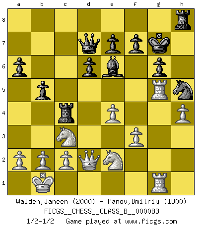 Last move : 1/2-1/2 2009 November 7 19:40:37 [Event "FICGS__CHESS__CLASS_B__000083"] [Site "FICGS"] [Date "2009.08.15"] [Round "1"] [White "Walden,Janeen"] [Black "Panov,Dmitriy"] [Result "1/2-1/2"] [WhiteElo "2000"] [BlackElo "1800"] 1.e4 c5 2.Nf3 d6 3.d4 cxd4 4.Nxd4 Nf6 5.Nc3 g6 6.Be3 Bg7 7.f3 O-O 8.Qd2 Nc6 9.Bc4 Bd7 10.O-O-O Rc8 11.Bb3 Ne5 12.Kb1 Nc4 13.Bxc4 Rxc4 14.g4 a6 15.h4 h5 16.gxh5 Nxh5 17.Rhg1 b5 18.Nde2 Be6 19.Bh6 Qd7 20.Bxg7 Kxg7 21.Rg5 Rh8 22.Rdg1 1/2-1/2 Sicilian : Dragon, Yugoslav attack, 7...O-O Kingside Castling by player Black (move 7) Queenside Castling by player White (move 10) This chess game ended in a draw. Follow this game move after move (download)The enormous mental resilience, without which no Chess player can exist, was so much taken up by Chess that he could never free his mind of this game. (Albert Einstein) Ich verlor meine Bürgerrechte, mein Gehalt wurde mir nicht mehr bezahlt und ich wurde zensiert und durfte nicht mehr ins Ausland reisen. [nach dem Match Fischer-Taimanov 6:0] (Mark Taimanov) Me gusta decir que Bobby Fischer fue el mejor jugador que jamás haya existido. Pero lo que hizo de Fischer un genio, fue su habilidad de mezclar una frescura y pragmatismo Americano con ideas Rusas acerca de la estrategia. (Bruce Pandolfini) Les Echecs ont trois composantes : le temps, l'espace et le matériel en dernier. (Mikhail Tal) We cannot be sure of having something to live for unless we are willing to die for it. (Ernesto Che Guevara)