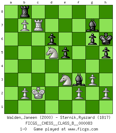 Last move : 1-0 2009 December 2 12:5:30 [Event "FICGS__CHESS__CLASS_B__000083"] [Site "FICGS"] [Date "2009.08.15"] [Round "1"] [White "Walden,Janeen"] [Black "Sternik,Ryszard"] [Result "1-0"] [WhiteElo "2000"] [BlackElo "1817"] 1.e4 c5 2.Nf3 Nc6 3.d4 cxd4 4.Nxd4 Nf6 5.Nc3 e5 6.Ndb5 d6 7.Bg5 a6 8.Na3 b5 9.Nd5 Be7 10.Bxf6 Bxf6 11.c3 O-O 12.Nc2 Bg5 13.a4 bxa4 14.Rxa4 a5 15.Bc4 Rb8 16.Ra2 Kh8 17.Nce3 g6 18.O-O f5 19.Qd3 a4 20.Rb1 Na5 21.Rxa4 Bd7 22.Rb4 Rxb4 23.cxb4 Nxc4 24.Qxc4 fxe4 25.Rd1 Be6 26.Qxe4 Qb8 27.Qd3 Bd8 28.b5 Bh4 29.g3 Bg5 30.Qa3 Rf7 31.Nc4 Be7 32.Qa6 Bg4 33.Ra1 Bf8 34.b6 Be2 35.Qa7 Rb7 36.Qxb8 Rxb8 37.Rc1 Bf3 38.Nce3 h5 39.Rc7 Bg7 40.b7 Kh7 41.Kf1 Kh6 42.Ke1 Kh7 43.Kd2 Kh6 44.Kc2 1-0 Sicilian : Pelikan (Lasker/Sveshnikov) variation Kingside Castling by player Black (move 11) Kingside Castling by player White (move 18) Player White won this chess game. Follow this game move after move (download)I play correspondence chess because it is both art and science while chess is art only. (A player at FICGS) Ich würde die 30 stärksten Spieler der USA im Simultanspiel besiegen. (José Raúl Capablanca) Yo adoro todas la posiciones. Denme una partida posicional difícil, y la jugaré. Pero posiciones totalmente ganadas, no las tolero. (Hein Donner) Dans le domaine de la peinture, de la gravure et de la sculpture, dès la première décennie de notre siècle, les artistes abandonnent la représentation de la partie d'échecs pour se concentrer sur les pièces, sur les échiquiers et sur toutes les variations auxquelles les unes et les autres peuvent donner lieu. On passe en quelque sorte d'un thème social à un thème musical (au sens de la musica médiévale, c'est-à-dire d'une notion qui inclue le rythme, l'harmonie, la construction et la déconstruction, etc.). Graphiquement et picturalement, l'échiquier apparaît comme une structure ouverte, dynamique, d'une richesse infinie, autorisant toutes les combinatoires et débouchant sur des mouvements et des rythmes de nature exponentielle. (Michel Pastoureau) If I had no sense of humor, I would long ago have committed suicide. (Mahatma Gandhi)