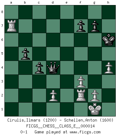 Last move : 0-1 2007 March 17 21:33:4 [Event "FICGS__CHESS__CLASS_E__000014"] [Site "FICGS"] [Date "2006.09.23"] [Round "1"] [White "Cirulis,Ilmars"] [Black "Schellen,Anton"] [Result "0-1"] [WhiteElo "1200"] [BlackElo "1600"] 1.b4 d5 2.Nf3 Nf6 3.Nc3 e5 4.Nxe5 d4 5.Na4 Bxb4 6.c3 dxc3 7.Nxc3 O-O 8.Qb3 Qd6 9.e3 c5 10.Nc4 Qc6 11.a3 Bxc3 12.Qxc3 Nbd7 13.Bb2 Re8 14.a4 b6 15.f3 Bb7 16.Bd3 Rad8 17.O-O Qe6 18.Qc2 Nf8 19.Bf5 Qe7 20.Rac1 Ba6 21.Rf2 Nd5 22.a5 Ng6 23.axb6 axb6 24.Ra1 Bxc4 25.Qxc4 Ne5 26.Qb3 c4 27.Qc2 Nb4 28.Bxh7+ Kh8 29.Qb1 Ned3 30.Bxd3 Nxd3 31.Rf1 Rd5 32.Bd4 Rxd4 33.exd4 Qf6 34.h3 Qg5 35.h4 Qg3 36.Qb5 Nf4 37.Qxe8+ Kh7 38.Qe4+ Kh6 39.Qxf4+ Qxf4 40.Rf2 Qxd4 41.Ra7 b5 0-1 Polish (Sokolsky) opening Kingside Castling by player Black (move 7) Kingside Castling by player White (move 17) Player Black won this chess game. Follow this game move after move (download)Nothing excites jaded Grandmasters more than a theoretical novelty. (Dominic Lawson) Es gibt zwei Arten von Opfern: Korrekte und meine. (Mikhail Nekhemyevich Tal) El Ajedrez es parte de la cultura, y si una cultura esta en decadencia, entonces también el Ajedrez declinará. (Mikhail Botvinnik) Aidez vos pièces, elles vous aideront. (Paul Morphy) There are two kinds of people in the world, my friend. Those who have a loaded gun and those who dig. You dig ! (Blondie in The Good, The Bad and The Ugly)