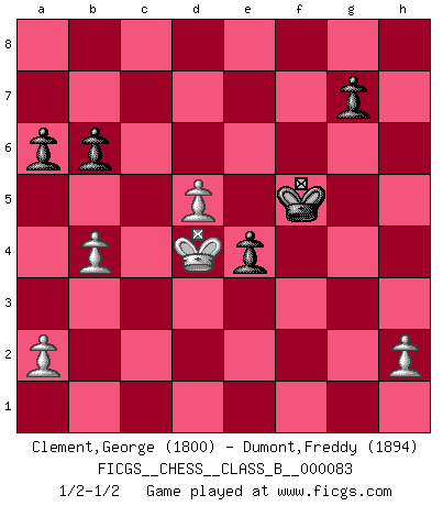 Last move : 1/2-1/2 2010 January 21 0:30:54 [Event "FICGS__CHESS__CLASS_B__000083"] [Site "FICGS"] [Date "2009.08.15"] [Round "1"] [White "Clement,George"] [Black "Dumont,Freddy"] [Result "1/2-1/2"] [WhiteElo "1800"] [BlackElo "1894"] 1.e4 c5 2.Nf3 d6 3.d4 cxd4 4.Qxd4 Nc6 5.Bb5 Bd7 6.Qd3 a6 7.Bxc6 Bxc6 8.Nc3 Nf6 9.O-O e6 10.Bf4 Be7 11.Rad1 O-O 12.Bxd6 Bxd6 13.Qxd6 Qxd6 14.Rxd6 Bxe4 15.Nxe4 Nxe4 16.Rb6 Rab8 17.Rd1 Rfd8 18.Rxd8+ Rxd8 19.Kf1 Rd7 20.Ne5 Rc7 21.Rb4 Nf6 22.Rc4 Rxc4 23.Nxc4 Kf8 24.Na5 b6 25.Nc6 Ke8 26.Ke2 Nd5 27.Kd3 f6 28.g3 Nc7 29.f4 Kd7 30.Nd4 Ne8 31.c4 Nd6 32.b4 e5 33.fxe5 fxe5 34.Nc2 h5 35.Ne3 Ne8 36.g4 hxg4 37.Nxg4 Ke6 38.Nf2 Kf5 39.Nd1 Nc7 40.Nc3 Ne6 41.Nd5 Nf4+ 42.Kc3 Nxd5+ 43.cxd5 e4 44.Kd4 1/2-1/2 Sicilian, Chekhover variation Kingside Castling by player White (move 9) Kingside Castling by player Black (move 11) 10 pieces endgame at move 43 : White KPPPP , Black KPPPP WHITE : King + 4 Pawns BLACK : King + 4 Pawns This chess game ended in a draw. Follow this game move after move (download)In order to improve your game, you must study the endgame before everything else, for whereas the endings can be studied and mastered by themselves, the middle game and the opening must be studied in relation to the endgame. (Jose Raul Capablanca) Ohne Fehler kann es keine Brillanz geben. (Emanuel Lasker) Bobby es el jugador de Ajedrez mas fino que este país jamás haya producido. Su memoria para las movidas, su brillantez en soñar combinaciones y su feróz determinación por la victoria son algo extraño. (John Collins) Mais l'homme est une créature légère et illogique : semblable au joueur d'échecs, il n'aime que le processus du but à atteindre, non le but lui-même. (Dostoïevsky) Gambling : The sure way of getting nothing from something. (Wilson Mizner)