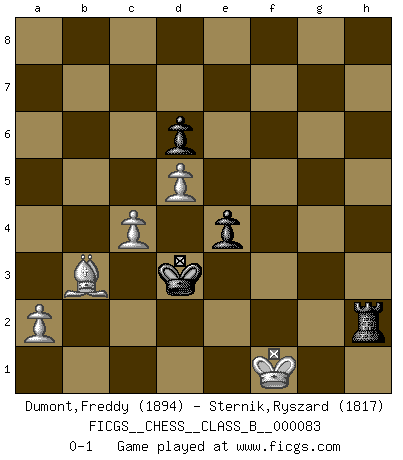 Last move : 0-1 2010 May 5 0:14:37 [Event "FICGS__CHESS__CLASS_B__000083"] [Site "FICGS"] [Date "2009.08.15"] [Round "1"] [White "Dumont,Freddy"] [Black "Sternik,Ryszard"] [Result "0-1"] [WhiteElo "1894"] [BlackElo "1817"] 1.e4 c5 2.Nf3 Nc6 3.d4 cxd4 4.Nxd4 Nf6 5.Nc3 e5 6.Ndb5 d6 7.Bg5 a6 8.Na3 b5 9.Bxf6 gxf6 10.Nd5 f5 11.Bd3 Be6 12.O-O Bxd5 13.exd5 Ne7 14.Nxb5 Bg7 15.Nc3 e4 16.Bc4 Qa5 17.Qd2 Rc8 18.Bb3 Bxc3 19.bxc3 Rg8 20.Qh6 Rg6 21.Qxh7 Qxc3 22.Rfe1 Kf8 23.Rad1 Qf6 24.Qh3 Kg7 25.Qe3 Qh4 26.Rd4 Rg8 27.Bc4 Kf6 28.g3 Rh6 29.Kf1 Qh3+ 30.Ke2 Qg4+ 31.Kd2 Rxh2 32.Re2 Qf3 33.Bxa6 Ra8 34.Bc4 Ng6 35.Bb3 Ne5 36.Rc4 Nxc4+ 37.Bxc4 Rc8 38.Qd4+ Kg6 39.Bb3 Qh1 40.Qe3 Qa1 41.g4 Rh1 42.gxf5+ Kf6 43.Re1 Rxe1 44.Qxe1 Qxe1+ 45.Kxe1 Kxf5 46.Ke2 Ke5 47.f3 f5 48.fxe4 fxe4 49.Kf2 Kf4 50.Ke2 Rh8 51.c4 Rh2+ 52.Kf1 Kf3 53.Bd1+ Ke3 54.Bb3 Kd3 0-1 Sicilian : Pelikan (Lasker/Sveshnikov) variation Kingside Castling by player White (move 12) 10 pieces endgame at move 48 : White KBPPPP , Black KRPP WHITE : King + 1 Bishop 4 Pawns BLACK : King + 1 Rook 2 Pawns 9 pieces endgame at move 48 : White KBPPP , Black KRPP WHITE : King + 1 Bishop 3 Pawns BLACK : King + 1 Rook 2 Pawns Player Black won this chess game. Follow this game move after move (download)The passed pawn is a criminal, who should be kept under lock and key. Mild measures, such as police surveillance, are not sufficient. (Nimzovitch) Wenn ich mich einlogge, glauben die Leute gewöhnlich nicht, dass ich es selbst bin und sie fangen an, mir dumme Fragen zu stellen. Und wenn sie es glauben, stellen sie wieder andere dumme Fragen. (Judith Polgar) El Ajedrez es de 30 a 40 por ciento psicología. Uno no cuenta con esto cuando se juega contra una computadora. No lo puedo confundir. (Judith Polgar) Karpov est une pièce de musée. (Garry Kasparov) I feel so... helpless. (C-3PO in Star Wars ep.3)
