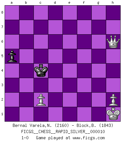 Last move : 1-0 2010 January 13 16:34:49 [Event "FICGS__CHESS__RAPID_SILVER__000010"] [Site "FICGS"] [Date "2009.08.17"] [Round "2"] [White "Bernal Varela,Nelson"] [Black "Block,Benjamin"] [Result "1-0"] [WhiteElo "2160"] [BlackElo "1843"] 1.e4 c5 2.Nf3 d6 3.d4 cxd4 4.Nxd4 Nf6 5.Nc3 a6 6.Bg5 e6 7.f4 Qb6 8.Qd2 Qxb2 9.Rb1 Qa3 10.e5 h6 11.Bh4 dxe5 12.fxe5 g5 13.exf6 gxh4 14.Be2 Qa5 15.O-O h3 16.Bf3 Qg5 17.Qf2 Nd7 18.Ne4 Qa5 19.Rfe1 hxg2 20.Qxg2 Ne5 21.Kh1 Bd7 22.Bh5 Rc8 23.Rbd1 Rc4 24.Nf3 Nxf3 25.Bxf7+ Kxf7 26.Rxd7+ Ke8 27.Red1 Rd4 28.R7xd4 Nxd4 29.Qg6+ Kd8 30.Rxd4+ Kc7 31.Qg3+ Kb6 32.Rc4 Qd5 33.Qe3+ Ka5 34.Rc8 b5 35.Qf3 Qb7 36.Re8 Qf7 37.Rb8 Rg8 38.Qe3 Bc5 39.Qxc5 Rxb8 40.Nd6 Qf8 41.a3 e5 42.Nc4+ Ka4 43.Nb2+ Ka5 44.Qc7+ Rb6 45.Qc3+ b4 46.Qxe5+ Rb5 47.Qc7+ Rb6 48.axb4+ Kxb4 49.Qxb6+ Kc3 50.Qc5+ Qxc5 51.Na4+ Kc4 52.Nxc5 Kxc5 53.f7 a5 54.f8Q+ Kc4 55.Qxh6 1-0 Sicilian : Najdorf, 7...Qb6 Kingside Castling by player White (move 15) 10 pieces endgame at move 49 : White KQNPPP , Black KQPP WHITE : King + 1 Queen 1 Knight 3 Pawns BLACK : King + 1 Queen 2 Pawns 9 pieces endgame at move 50 : White KNPPP , Black KQPP WHITE : King + 1 Knight 3 Pawns BLACK : King + 1 Queen 2 Pawns 8 pieces endgame at move 52 : White KNPPP , Black KPP WHITE : King + 1 Knight 3 Pawns BLACK : King + 2 Pawns 7 pieces endgame at move 52 : White KPPP , Black KPP WHITE : King + 3 Pawns BLACK : King + 2 Pawns Promotion Queen by player White (move 54) 6 pieces endgame at move 55 : White KQPP , Black KP WHITE : King + 1 Queen 2 Pawns BLACK : King + 1 Pawn Player White won this chess game. Follow this game move after move (download)He who fears an isolated Queen's Pawn should give up Chess. (Siegbert Tarrasch) Ja, ich habe einmal eine Blitzpartie gespielt, es war in einem Zug, 1929. --im Interview 1989 (Mikhail Moiseyevich Botvinik) Dejen al perfeccionista jugar por correo. (Yasser Seirawan) Vous m'avez demandé de vous exposer quel est le fondement de la prière. Je ne fais que préparer les pièces du jeu sur la table... Nous sera-t-il permis d'en adopter les règles et si nous les appliquons scrupuleusement nous ne tarderons pas à faire mat le Roi divin ! Il ne pourra échapper à nos mains. (Sainte Thérèse d'Avila, Chemin de perfection) Think like a man of action, act like a man of thought. (Henri Louis Bergson)
