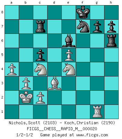 Last move : 1/2-1/2 2009 August 25 13:54:38 [Event "FICGS__CHESS__RAPID_M__000020"] [Site "FICGS"] [Date "2009.08.17"] [Round "1"] [White "Nichols,Scott"] [Black "Koch,Christian"] [Result "1/2-1/2"] [WhiteElo "2103"] [BlackElo "2190"] 1.e4 c5 2.Nf3 d6 3.d4 cxd4 4.Nxd4 Nf6 5.Nc3 a6 6.Be3 e5 7.Nb3 Be6 8.f3 Be7 9.Qd2 O-O 10.O-O-O Nbd7 11.g4 b5 12.g5 b4 13.Ne2 Ne8 14.f4 exf4 15.Bxf4 Nc5 16.Qxb4 a5 17.Qxc5 dxc5 18.Rxd8 Rxd8 19.Nxa5 Rc8 20.h4 f6 21.Nc3 fxg5 22.Bxg5 Bxg5+ 23.hxg5 Nd6 24.b3 Rf3 25.Kb2 Rg3 26.e5 Nf7 27.Nc4 Rxg5 28.Ne4 Rg6 29.a4 Rc7 30.Bd3 Rh6 31.Rg1 Kf8 1/2-1/2 Sicilian : Najdorf, Byrne (English) attack Kingside Castling by player Black (move 9) Queenside Castling by player White (move 10) This chess game ended in a draw. Follow this game move after move (download)Fischer is completely natural. He plays no roles. He's like a child. Very, very simple. (Zita Rajcsanyi) Im Schach gewinnt jeder. Hat man Freunde am Spiel - und das ist die Hauptsache - ist auch der Verlust einer Partie kein Unglück. (David Bronstein) Aún deseo matar a Fischer. (Boris Spassky) Karpov est une pièce de musée. (Garry Kasparov) A good player is always lucky. (Capablanca)