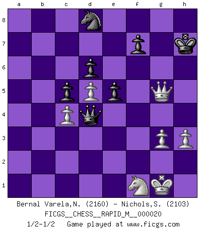 Last move : 1/2-1/2 2009 October 19 1:25:26 [Event "FICGS__CHESS__RAPID_M__000020"] [Site "FICGS"] [Date "2009.08.17"] [Round "1"] [White "Bernal Varela,Nelson"] [Black "Nichols,Scott"] [Result "1/2-1/2"] [WhiteElo "2160"] [BlackElo "2103"] 1.e4 e5 2.Nf3 Nc6 3.Bb5 a6 4.Ba4 Nf6 5.O-O Be7 6.Re1 b5 7.Bb3 O-O 8.c3 d6 9.h3 Na5 10.Bc2 c5 11.d4 Qc7 12.d5 Bd7 13.b3 Nb7 14.Qe2 Rfc8 15.c4 h6 16.Nh4 Bf8 17.Qf3 Qd8 18.Nf5 Kh7 19.Qe3 b4 20.Nd2 g6 21.Ng3 Bg7 22.a3 a5 23.Nf3 Ne8 24.Qe2 bxa3 25.Nd2 a4 26.bxa4 Bxa4 27.Bxa4 Rxa4 28.Bxa3 Rca8 29.Qd3 Qd7 30.Bb2 h5 31.Qc2 Bh6 32.Ngf1 Nf6 33.Reb1 Nd8 34.Qd3 h4 35.Qc2 Rxa1 36.Rxa1 Rxa1 37.Bxa1 Qa7 38.Bc3 Qa6 39.Nh2 Bf4 40.Nhf3 g5 41.Qd3 Qa3 42.Nf1 Kh6 43.N3h2 Nb7 44.g3 hxg3 45.Nxg3 Bxg3 46.fxg3 Qc1+ 47.Nf1 Nxe4 48.Qxe4 Qxc3 49.Qf5 Qd4+ 50.Kg2 Nd8 51.Qf6+ Kh7 52.Qxg5 Qb2+ 53.Kg1 Qd4+ 54.Kg2 Qb2+ 55.Kg1 Qd4+ 1/2-1/2 Ruy Lopez : Closed, 7...O-O Kingside Castling by player White (move 5) Kingside Castling by player Black (move 7) This chess game ended in a draw. Follow this game move after move (download)Chess is a forcing house where the fruits of character can ripen more fully than in life. (Edward Morgan Foster) Wenn Du absolut nicht mehr weißt, was Du tun sollst, dann ist es Zeit für Panik. (John van der Wiel) El Ajedrez es tan interesante por sí solo, que no es necesario un interés monetario para persuadir a una persona a que lo practique; por lo tanto, nunca se juega por dinero. (Benjamin Franklin) Les réformistes prétendent que les progrès de la théorie conduiront à la disparition des échecs, et qu'il faut, pour leur rendre vie, en remanier les règles. En réalité, qu'exprime cette affirmation? Le mépris de l'intuition, de l'imagination et de tous les autres éléments qui font des échecs un art. (Alexander Alekhine) I think your argument is specious - I think your tie is ugly. (Gregory House to Dr. Foreman, House M.D.)