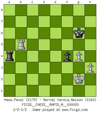 Last move : 1/2-1/2 2009 December 16 16:57:17 [Event "FICGS__CHESS__RAPID_M__000020"] [Site "FICGS"] [Date "2009.08.17"] [Round "1"] [White "Hase,Pavel"] [Black "Bernal Varela,Nelson"] [Result "1/2-1/2"] [WhiteElo "2179"] [BlackElo "2160"] 1.e4 c5 2.Nf3 d6 3.d4 cxd4 4.Nxd4 Nf6 5.Nc3 a6 6.Bg5 e6 7.f4 Qb6 8.Qd2 Qxb2 9.Rb1 Qa3 10.e5 h6 11.Bh4 dxe5 12.fxe5 g5 13.exf6 gxh4 14.Be2 Qa5 15.O-O Nd7 16.Kh1 Qg5 17.Rf4 e5 18.Nd5 exd4 19.Bf3 Bd6 20.Qxd4 Kf8 21.Re4 Nc5 22.R4e1 Ne6 23.Qb6 Bc5 24.Qa5 Kg8 25.Rb5 b6 26.Ne7+ Kf8 27.Rxc5 Qxc5 28.Qxc5 Nxc5 29.Bxa8 Be6 30.Bc6 Bd7 31.Bxd7 Nxd7 32.Nd5 h5 33.c4 Rh6 34.Rf1 Kg8 35.Rb1 Kf8 36.Kg1 Rg6 37.h3 Nxf6 38.Nf4 Rg5 39.Rxb6 Rf5 40.Nd5 Nxd5 41.cxd5 Rxd5 42.Rxa6 Rd1+ 43.Kh2 Rd4 44.Ra5 f6 45.Rxh5 Ra4 46.Rh7 Kg8 47.Rb7 f5 48.a3 Rxa3 49.Rb4 Kg7 50.Rxh4 Kf6 51.Rf4 Kg5 52.g3 Ra2+ 53.Kg1 Ra1+ 54.Kg2 Ra2+ 55.Rf2 Ra4 56.Rb2 f4 57.Rb5+ Kg6 58.g4 1/2-1/2 Sicilian : Najdorf, 7...Qb6 Kingside Castling by player White (move 15) 10 pieces endgame at move 42 : White KRPPP , Black KRPPP WHITE : King + 1 Rook 3 Pawns BLACK : King + 1 Rook 3 Pawns 9 pieces endgame at move 45 : White KRPPP , Black KRPP WHITE : King + 1 Rook 3 Pawns BLACK : King + 1 Rook 2 Pawns 8 pieces endgame at move 48 : White KRPP , Black KRPP WHITE : King + 1 Rook 2 Pawns BLACK : King + 1 Rook 2 Pawns 7 pieces endgame at move 50 : White KRPP , Black KRP WHITE : King + 1 Rook 2 Pawns BLACK : King + 1 Rook 1 Pawn This chess game ended in a draw. Follow this game move after move (download)The hallmark of the artist is simplicity. (Larry Evans) Sie bekommen vielleicht den Eindruck, dass die Spitzenspieler überhaupt gar nicht so stark sind. Aber das stimmt nicht. Es ist eine Illusion. Mit einem Computer an der Seite ist es sehr leicht, Urteile zu fällen, aber wenn man alleine am Brett sitzt, sieht die Sache ganz anders aus. (Vladimir Kramnik) Debió haber existido una vez en que los hombres eran semidióses, de otra manera no hubiesen podido inventar el Ajedrez. (Gustav Schenk) Les échecs sont plus proches de l'art de l'assassinat que de l'art de la guerre. (Arturo Perez-Reverte) Whoever said the pen is mightier than the sword obviously never encountered automatic weapons. (US General Douglas MacArthur)