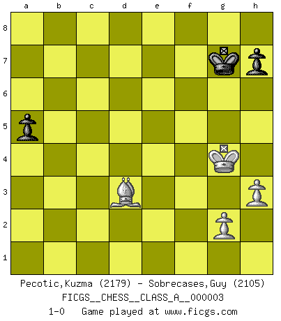 Last move : 1-0 2006 October 20 9:58:28 [Event "FICGS__CHESS__CLASS_A__000003"] [Site "FICGS"] [Date "2006.04.22"] [Round "1"] [White "Pecotic,Kuzma"] [Black "Sobrecases,Guy"] [Result "1-0"] [WhiteElo "2179"] [BlackElo "2105"] 1.e4 c5 2.Nf3 e6 3.d4 cxd4 4.Nxd4 Nf6 5.Nc3 Nc6 6.Nxc6 bxc6 7.e5 Nd5 8.Ne4 Qc7 9.f4 Qa5+ 10.Bd2 Qb6 11.Bd3 Qxb2 12.O-O Qd4+ 13.Kh1 Ba6 14.Bxa6 Qxe4 15.Rb1 Qa4 16.Bd3 f5 17.exf6 Nxf6 18.Bc3 Be7 19.Rb7 Rd8 20.f5 O-O 21.fxe6 Nd5 22.Rxf8+ Rxf8 23.Bb2 Nf4 24.exd7 Qxa2 25.Bf1 Ne6 26.h3 Qd5 27.Bd3 Bd8 28.Rb5 Rf1+ 29.Qxf1 cxb5 30.Bxb5 Bf6 31.Bxf6 gxf6 32.Qxf6 Qd1+ 33.Kh2 Qd6+ 34.Kg1 Qd1+ 35.Kf2 Qxc2+ 36.Kf3 Qb3+ 37.Kg4 Qb4+ 38.Kg3 Qe4 39.Qxe6+ Qxe6 40.d8Q+ Kg7 41.Qd4+ Kh6 42.Bd3 a5 43.Qf4+ Kg7 44.Qg4+ Qxg4+ 45.Kxg4 1-0 Sicilian : Anderssen variation Kingside Castling by player White (move 12) Kingside Castling by player Black (move 20) 10 pieces endgame at move 39 : White KQBPPP , Black KQPP WHITE : King + 1 Queen 1 Bishop 3 Pawns BLACK : King + 1 Queen 2 Pawns 9 pieces endgame at move 39 : White KBPPP , Black KQPP WHITE : King + 1 Bishop 3 Pawns BLACK : King + 1 Queen 2 Pawns Promotion Queen by player White (move 40) 8 pieces endgame at move 44 : White KBPP , Black KQPP WHITE : King + 1 Bishop 2 Pawns BLACK : King + 1 Queen 2 Pawns 7 pieces endgame at move 45 : White KBPP , Black KPP WHITE : King + 1 Bishop 2 Pawns BLACK : King + 2 Pawns Player White won this chess game. Follow this game move after move (download)Chess is ruthless: you've got to be prepared to kill people. (Nigel Short) Nicht daß Diemer aus Opportunismus Mitglied der NSDAP geworden wäre. Er war ein Fanatiker, in allem, was er tat. (Hans Ree) Cuando tengo las piezas blancas, yo gano porque soy blanco; Cuando tengo las piezas negras, yo gano porque soy Bogolyubov. (Bogolyubov) Le succès, c'est être capable d'aller d'échec en échec sans perdre son enthousiasme. (Winston Churchill) The difference between perseverance and obstinacy is that one comes from a strong will, and the other from a strong won't. (Henry Ward Beecher)
