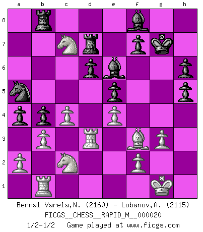 Last move : 1/2-1/2 2009 December 9 21:27:44 [Event "FICGS__CHESS__RAPID_M__000020"] [Site "FICGS"] [Date "2009.08.17"] [Round "1"] [White "Bernal Varela,Nelson"] [Black "Lobanov,Alex"] [Result "1/2-1/2"] [WhiteElo "2160"] [BlackElo "2115"] 1.e4 c5 2.Nf3 Nc6 3.d4 cxd4 4.Nxd4 Nf6 5.Nc3 e5 6.Ndb5 d6 7.Bg5 a6 8.Na3 b5 9.Nd5 Be7 10.Bxf6 Bxf6 11.c4 b4 12.Nc2 a5 13.Qd3 O-O 14.g3 Be6 15.Bg2 g6 16.h4 h6 17.h5 Bg7 18.Rd1 Rb8 19.b3 Qd7 20.Rd2 a4 21.O-O Rfd8 22.Qf3 Kh8 23.Rb1 Qa7 24.Rbd1 Qd7 25.Qe3 gxh5 26.Nf6 Qa7 27.Qxa7 Nxa7 28.Nd5 Nc6 29.Nc7 Bf8 30.Rd3 Na5 31.Rb1 Kg7 32.Bf3 Rd7 1/2-1/2 Sicilian : Pelikan (Lasker/Sveshnikov) variation Kingside Castling by player Black (move 13) Kingside Castling by player White (move 21) This chess game ended in a draw. Follow this game move after move (download)Fischer was a master of clarity and a king of artful positioning. His opponents would see where he was going but were powerless to stop him. (Bruce Pandolfini) Wir irren allesamt, nur jeder irrt anders. (Georg Christoph Lichtenberg) Un jugador que es sorprendido, esta derrotado a medias. (Proverbio) Vous savez, camarade Pachman, je n'éprouve pas de plaisir à être ministre, je jouerais plutôt aux échecs comme vous, ou alors ferais une révolution au Venezuela. (Che Guevara à Ludek Pachman, 'Checkmate in Prague', 1975) Art is not a thing, it is a way. (Elbert Hubbard)