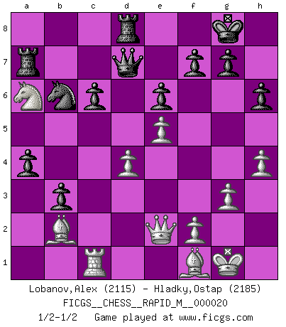Last move : 1/2-1/2 2010 January 15 5:2:22 [Event "FICGS__CHESS__RAPID_M__000020"] [Site "FICGS"] [Date "2009.08.17"] [Round "1"] [White "Lobanov,Alex"] [Black "Hladky,Ostap"] [Result "1/2-1/2"] [WhiteElo "2115"] [BlackElo "2185"] 1.Nf3 d5 2.d4 Nf6 3.c4 c6 4.Nc3 e6 5.g3 Nbd7 6.a4 a5 7.Qd3 Bb4 8.Bg2 O-O 9.O-O b6 10.b3 Ba6 11.Bb2 Qe7 12.Rac1 Rfd8 13.Ba1 Rac8 14.Rfd1 Ng4 15.h3 Ngf6 16.Bb2 Ne8 17.e4 dxc4 18.bxc4 Nd6 19.Na2 Nxc4 20.Rxc4 Nc5 21.Qc2 Bxc4 22.Qxc4 Nxa4 23.Ba1 b5 24.Qc2 Bd6 25.h4 h6 26.e5 Ba3 27.Bf1 Qd7 28.Rb1 Rb8 29.Nc1 Nb6 30.Qe4 Qd5 31.Qe2 Bxc1 32.Rxc1 b4 33.Ne1 a4 34.Nd3 b3 35.Nb4 Qd7 36.Bb2 Ra8 37.Na6 Ra7 1/2-1/2 Reti Opening Kingside Castling by player Black (move 8) Kingside Castling by player White (move 9) This chess game ended in a draw. Follow this game move after move (download)We like to think. (Gary Kasparov) Das Schach hält seine Meister in eigenen Banden, Fesseln; auf vielerlei Weise formt es ihren Geist, so dass die innere Freiheit selbst des Stärksten beeinflusst wird. (Albert Einstein) Solo puedes ser bueno en el Ajedrez si amas al juego. (Bobby Fischer) Des combinaisons [dans le jeu d'échecs] pareilles à des mélodies. Je crois entendre pour ainsi dire la musique des coups... (Vladimir Nabokov) The arrogant army will lose certainly the battle. (Chinese proverb)