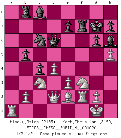 Last move : 1/2-1/2 2009 November 4 11:57:59 [Event "FICGS__CHESS__RAPID_M__000020"] [Site "FICGS"] [Date "2009.08.17"] [Round "1"] [White "Hladky,Ostap"] [Black "Koch,Christian"] [Result "1/2-1/2"] [WhiteElo "2185"] [BlackElo "2190"] 1.d4 Nf6 2.c4 g6 3.Nc3 d5 4.Nf3 Bg7 5.Qb3 dxc4 6.Qxc4 O-O 7.e4 a6 8.Qb3 b5 9.e5 Nfd7 10.h4 c5 11.e6 c4 12.exf7+ Rxf7 13.Qd1 Nb6 14.h5 Nc6 15.Be3 Nd5 16.a4 Rb8 17.Be2 Nxe3 18.fxe3 Qc7 19.O-O Bh6 20.axb5 axb5 21.Qd2 Qd6 22.Rf2 Kg7 23.Ne4 Qd5 24.Nc3 Qd6 25.Ne4 Qd5 26.Nc3 Qd6 1/2-1/2 King's Indian defense, 3.Nc3 Kingside Castling by player Black (move 6) Kingside Castling by player White (move 19) This chess game ended in a draw. Follow this game move after move (download)Not all artists are Chess players, but all Chess players are artists. (Marcel Duchamp) Ich möchte Schüler heranbilden, die das Vermögen haben, selbst zu denken und Kritik zu üben. (Emanuel Lasker) Repentinamente, me resultaba obvio en mi analisis que yo había pasado por alto lo que Fischer había visto en el tablero con la mas grande facilidad. (Mikhail Botvinnik) Aidez vos pièces, elles vous aideront. (Paul Morphy) However beautiful the strategy, you should occasionally look at the results. (Winston Churchill)