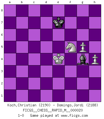 Last move : 1-0 2009 December 31 0:55:6 [Event "FICGS__CHESS__RAPID_M__000020"] [Site "FICGS"] [Date "2009.08.17"] [Round "1"] [White "Koch,Christian"] [Black "Domingo,Jordi"] [Result "1-0"] [WhiteElo "2190"] [BlackElo "2188"] 1.e4 e5 2.Nf3 f5 3.Nxe5 Qf6 4.Nc4 fxe4 5.Nc3 Qg6 6.d3 Bb4 7.dxe4 Qxe4+ 8.Ne3 Bxc3+ 9.bxc3 Ne7 10.Bc4 d5 11.Bxd5 Nxd5 12.Qh5+ Kd7 13.Qxd5+ Qxd5 14.Nxd5 Na6 15.Be3 Ke6 16.Nf4+ Kf7 17.O-O Bf5 18.Nd3 Rhe8 19.h3 b6 20.a4 c5 21.a5 c4 22.Nf4 b5 23.Rad1 Bxc2 24.Rd6 Nc7 25.Bc5 Rad8 26.Rxd8 Rxd8 27.Bxa7 Na6 28.Bb6 Rd1 29.Rxd1 Bxd1 30.Kf1 b4 31.cxb4 Nxb4 32.Ne2 Ba4 33.Bd4 Bc6 34.Bc3 Nd5 35.a6 g6 36.a7 Ke7 37.Be5 Kd7 38.Nd4 Ba8 39.Ke2 Kc8 40.Ne6 Kb7 41.Bb8 Nc3+ 42.Kd2 Nb5 43.Nf8 Nxa7 44.Bxa7 Kxa7 45.f3 Kb6 46.Nxh7 Bc6 47.Kc3 Kc5 48.Nf8 Be8 49.h4 Kd5 50.g3 Kc5 51.Ne6+ Kd6 52.Nd4 Bf7 53.Nc2 Bd5 54.f4 Kc5 55.Ne3 Be6 56.g4 Bf7 57.g5 Be8 58.Ng4 Kd6 59.Kxc4 Ke6 60.Ne3 Bc6 61.Kd3 Bf3 62.Nc2 Bh5 63.Ke4 Bg4 64.Nd4+ Ke7 65.f5 gxf5+ 66.Nxf5+ 1-0 Latvian counter-gambit Kingside Castling by player White (move 17) 10 pieces endgame at move 44 : White KNPPP , Black KBPPP WHITE : King + 1 Knight 3 Pawns BLACK : King + 1 Bishop 3 Pawns 9 pieces endgame at move 46 : White KNPPP , Black KBPP WHITE : King + 1 Knight 3 Pawns BLACK : King + 1 Bishop 2 Pawns 8 pieces endgame at move 59 : White KNPPP , Black KBP WHITE : King + 1 Knight 3 Pawns BLACK : King + 1 Bishop 1 Pawn 7 pieces endgame at move 65 : White KNPP , Black KBP WHITE : King + 1 Knight 2 Pawns BLACK : King + 1 Bishop 1 Pawn 6 pieces endgame at move 66 : White KNPP , Black KB WHITE : King + 1 Knight 2 Pawns BLACK : King + 1 Bishop Player White won this chess game. Follow this game move after move (download)Before the endgame, the Gods have placed the middle game. (Siegbert Tarrasch) Die jungen Leute sollen verstehen, dass sie noch etwas von mir lernen können und müssen. (Viktor Kortschnoi) ¿Esta Bobby Fischer algo cuerdo?. (Salo Flohr) Le jeu d'échecs est comme rejeté hors du temps. (Antoine de Saint-Exupéry) Pretend inferiority and encourage his arrogance. (Sun Tzu)