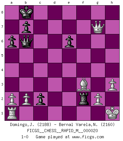 Last move : 1-0 2009 December 1 5:35:59 [Event "FICGS__CHESS__RAPID_M__000020"] [Site "FICGS"] [Date "2009.08.17"] [Round "1"] [White "Domingo,Jordi"] [Black "Bernal Varela,Nelson"] [Result "1-0"] [WhiteElo "2188"] [BlackElo "2160"] 1.e4 c5 2.Nf3 d6 3.d4 cxd4 4.Nxd4 Nf6 5.Nc3 a6 6.Be3 Ng4 7.Bg5 h6 8.Bh4 g5 9.Bg3 Bg7 10.h3 Ne5 11.Nf5 Bxf5 12.exf5 Nbc6 13.Nd5 e6 14.fxe6 fxe6 15.Ne3 O-O 16.Be2 d5 17.O-O Qb6 18.Re1 Rad8 19.Bh5 d4 20.Ng4 d3 21.Nxe5 Nxe5 22.Bxe5 Rxf2 23.Kh1 dxc2 24.Qg4 R8d2 25.Qa4 Bxe5 26.Rxe5 Kg7 27.Qe8 Rd1+ 28.Re1 Rxa1 29.Qg6+ Kf8 30.Qxh6+ Ke7 31.Qxg5+ Kd7 32.Qg7+ Kc8 33.Rxa1 Kb8 34.Bf3 1-0 Sicilian : Najdorf, Byrne (English) attack Kingside Castling by player Black (move 15) Kingside Castling by player White (move 17) Player White won this chess game. Follow this game move after move (download)White lost because he failed to remember the right continuation and had to think up the moves himself. (Siegbert Tarrasch) Das typische an einem Großmeister ist, daß er eine gewonnene Position schnell und schmerzlos gewinnt. (Irving Chernev) Yo nunca en mi vida he jugado la Defensa Francesa, que viene siendo la más aburrida de todas las Aperturas. (Wilhelm Steinitz) Que feriez-vous si vous étiez en train de jouer aux échecs et que la fin du monde arrive ? Je continuerais à jouer. (Saint Borromée) Indecision is the key to flexibility. (Unknown)