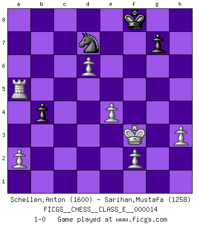 Last move : 1-0 2007 May 29 8:54:43 [Event "FICGS__CHESS__CLASS_E__000014"] [Site "FICGS"] [Date "2006.09.23"] [Round "1"] [White "Schellen,Anton"] [Black "Sarihan,Mustafa"] [Result "1-0"] [WhiteElo "1600"] [BlackElo "1258"] 1.b4 e5 2.Bb2 d6 3.e3 c6 4.Nf3 Bg4 5.h3 Bh5 6.Be2 Nf6 7.O-O Be7 8.c4 O-O 9.d3 Nbd7 10.Nbd2 Qc7 11.Rc1 d5 12.cxd5 Nxd5 13.b5 Rab8 14.Qb3 Bd6 15.Ne4 N5f6 16.Nxd6 Qxd6 17.Rfd1 Rfc8 18.g4 Bg6 19.Qa3 Qxa3 20.Bxa3 cxb5 21.Bd6 Rxc1 22.Rxc1 Re8 23.Rc7 Re6 24.Ba3 h6 25.g5 hxg5 26.Nxg5 Rc6 27.Rxb7 a6 28.Ra7 Rb6 29.Bc5 Rb8 30.Bd6 Rc8 31.Kg2 Nb8 32.Ra8 Nfd7 33.e4 f6 34.Bg4 Re8 35.Be6+ Kh8 36.Nf7+ Bxf7 37.Bxf7 Rd8 38.Be6 Nf8 39.Bc7 Nxe6 40.Bxd8 Nd7 41.Bxf6 Kh7 42.Be7 Ndc5 43.Bxc5 Nxc5 44.Rd8 Ne6 45.Rd6 Nf4+ 46.Kf3 a5 47.d4 Nd3 48.d5 Kg8 49.Rb6 b4 50.d6 Nc5 51.Rb5 Nd7 52.Rb7 Nc5 53.Re7 Kf8 54.Rxe5 Nd7 55.Rxa5 1-0 Polish (Sokolsky) opening Kingside Castling by player White (move 7) Kingside Castling by player Black (move 8) Player White won this chess game. Follow this game move after move (download)I'm not a materialistic person, in that, I don't suffer the lack or loss of money. The absence of worldly goods I don't look back on. For Chess is a way I can be as materialistic as I want without having to sell my soul. (Jamie Walter Adams) Modernes Schach erfordert enorme Anspannung. Es ist für einen normalen Menschen unmöglich das auszuhalten. (Viktor Kortschnoi) El juego de Damas es para vagabundos. (Paul Morphy) Les échecs c'est le défi de l'alpiniste, toujours plus haut, prêt à tout pour monter à l'assaut du Roi ennemi. Les échecs, c'est de la musique en mouvement, un ballet majestueux pour les yeux. C'est de la poésie composée par les fantômes du passé qui au même titre que Rimbaud ou Verlaine méritent notre admiration. Les échecs, c'est de la peinture ou le moindre mouvement modifie le tableau pour en faire un Picasso ou un Van Gogh. Les échecs, c'est tout et rien, c'est la vie et la mort. Jjulie33 sur le forum de France-Echecs. Home computers are being called upon to perform many new functions, including the consumption of homework formerly eaten by the dog. (Doug Larson)