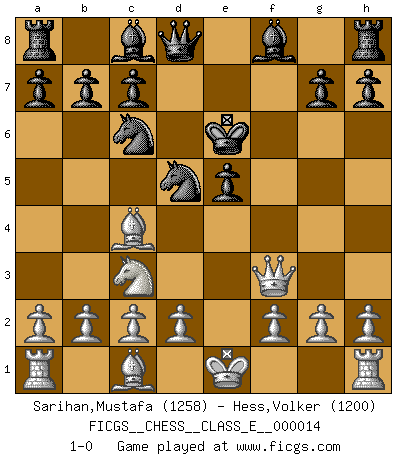 Last move : 1-0 2006 September 28 6:54:2 [Event "FICGS__CHESS__CLASS_E__000014"] [Site "FICGS"] [Date "2006.09.23"] [Round "1"] [White "Sarihan,Mustafa"] [Black "Hess,Volker"] [Result "1-0"] [WhiteElo "1258"] [BlackElo "1200"] 1.e4 e5 2.Nf3 Nc6 3.Bc4 Nf6 4.Ng5 d5 5.exd5 Nxd5 6.Nxf7 Kxf7 7.Qf3+ Ke6 8.Nc3 1-0 Two knights defense : Fegatello attack Player White won this chess game. Follow this game move after move (download)Fischer is an American Chess tragedy on par with Morphy and Pillsbury. (Mig Greengard) Sie führen leise Selbstgespräche, schlürfen lautstark ihre Getränke, schmatzen hörbar beim Essen, blasen ihrem Gegenüber Rauch in die Augen, niesen ihm ins Gesicht, starren ihn unverwandt an, bis er sich unter ihren Blicken windet, rutschen ständig auf ihrem Stuhl hin und her, rülpsen und bohren in der Nase. (Anonymous) El Jaque al descubierto es el bombardero del tablero. (Reuben Fine) Les Echecs sont affaire de jugement sensible. Savoir quand frapper et quand esquiver. (Fischer) If only people were all showed a certain minimum level of niceness; if only people didn't retract verbal draw offers (without draw box ticked) on ficgs; if only people didn't kill; if only people didn't run concentration / extermination camps, if only people didn't drop nuclear bombs on Hiroshima and Nagasaki, and so on - it would be a much more beautiful world. But sadly, things are not so... (Normajean Yates)