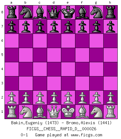 Last move : 0-1 2009 September 17 10:20:6 [Event "FICGS__CHESS__RAPID_D__000026"] [Site "FICGS"] [Date "2009.08.18"] [Round "1"] [White "Bakin,Eugeniy"] [Black "Bromo,Alexis"] [Result "0-1"] [WhiteElo "1473"] [BlackElo "1441"] 0-1 This chess game has been lost on time (started : 2009.08.18 1:5:23) Player Black won this chess game. Follow this game move after move (download)Do you realize Fischer almost never has any bad pieces? He exchanges them, and the bad pieces remain with his opponents. (Yuri Balashov) Man kann eine Schachpartie nur gewinnen, wenn das Gleichgewicht gestört ist. In einer Stellung mit ungestörtem Gleichgewicht ist auch das größte Genie hilflos - in der Stellung steckt dann eben kein genialer Einfall. (Wilhelm Steinitz) Todavía soy una víctima del Ajedrez. Tiene toda la belleza del arte y mucho mas. No puede ser comercializado. El Ajedrez es mas puro que el arte en su posición social. (Marcel Duchamp) Les Cavaliers se révèlent fort utiles dans les positions fermées. D'habitude, les Fous sont un peu plus forts que les Cavaliers dans les positions ouvertes. Qu'on le veuille ou non, il restera toujours des exceptions ! The only thing that overcomes hard luck is hard work. (Harry Golden)
