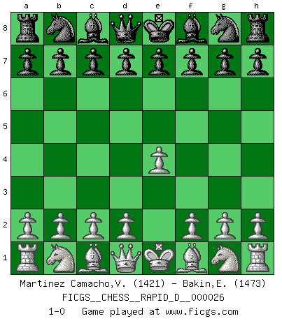 Last move : 1-0 2009 September 17 22:22:49 [Event "FICGS__CHESS__RAPID_D__000026"] [Site "FICGS"] [Date "2009.08.18"] [Round "1"] [White "Martinez Camacho,Victor Hugo"] [Black "Bakin,Eugeniy"] [Result "1-0"] [WhiteElo "1421"] [BlackElo "1473"] 1.e4 1-0 This chess game has been lost on time (started : 2009.08.18 1:5:23) King's pawn Opening Player White won this chess game. Follow this game move after move (download)The Pawns are the soul of the game. (Francois Andre Danican Philidor) Lisa Lane, amerikanische Schachmeisterin, hatte Fischer einmal als stärksten lebenden Spieler bezeichnet. Antwort: Das ist richtig, aber Lisa Lane ist eigentlich nicht in der Lage, das zu beurteilen. (Robert James Fischer) De todos mis libros Rusos, la defensa contiene y difunde el 'calor' mas grande que pudiese verse extraño al observar lo supremamente abstracto que el Ajedrez supuestamente es. (Vladimir Nabokov) Psychologiquement, tu dois avoir confiance en toi même, mais cette confiance doit être basée sur des faits. (Robert Fischer) Ah, beer! The cause of, and the solution to, all of life's problems. (Homer Simpson)