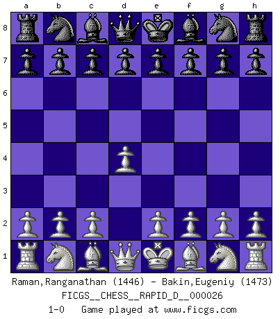 Last move : 1-0 2009 September 17 10:20:6 [Event "FICGS__CHESS__RAPID_D__000026"] [Site "FICGS"] [Date "2009.08.18"] [Round "1"] [White "Raman,Ranganathan"] [Black "Bakin,Eugeniy"] [Result "1-0"] [WhiteElo "1446"] [BlackElo "1473"] 1.d4 1-0 This chess game has been lost on time (started : 2009.08.18 1:5:23) Queen's pawn Player White won this chess game. Follow this game move after move (download)Morphy was probably the greatest genius of them all. (Bobby Fischer) Wenn Du einsam bist, wenn Du Dich in der Welt wie ein Fremder fühlst, spiele Schach. Das wird Deinen Geist erheben und Dein Ratgeber im Kampf sein. (Aristoteles) Siempre es mucho mejor sacrificar las piezas de tu oponente. (Savielly Tartakover) Je fais ceci parce que dans cinquante coups j'obtiendrai cela; je m'appelle Mikhail Moisevitch Botvinnik. (Botvinnik) All war is based on deception. (Sun Tzu)