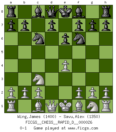 Last move : 0-1 2009 September 24 21:52:36 [Event "FICGS__CHESS__RAPID_D__000026"] [Site "FICGS"] [Date "2009.08.18"] [Round "1"] [White "Wing,James"] [Black "Savu,Alex"] [Result "0-1"] [WhiteElo "1400"] [BlackElo "1350"] 1.e4 c5 2.d4 cxd4 3.Qxd4 Nc6 4.Qd1 Nf6 5.Nc3 e6 0-1 This chess game has been lost on time (started : 2009.08.18 1:5:23) Sicilian : Smith-Morra gambit Player Black won this chess game. Follow this game move after move (download)A player surprised is half beaten. (Proverb) Gott hat gewollt, dass ich Champion werde. (Surab Azmajparaschvili) No es una movida, aún la mejor movida que tu debas buscar, sino un plan comprensible. (Eugene Znosko-Borovsky) A chaque perte on perd un peu de soi. (Joël Lautier) Computers have lots of memory but no imagination. (Anonymous)