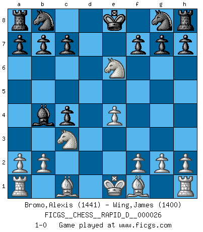 Last move : 1-0 2009 September 26 9:55:18 [Event "FICGS__CHESS__RAPID_D__000026"] [Site "FICGS"] [Date "2009.08.18"] [Round "1"] [White "Bromo,Alexis"] [Black "Wing,James"] [Result "1-0"] [WhiteElo "1441"] [BlackElo "1400"] 1.d4 d5 2.c4 dxc4 3.e4 e5 4.Nf3 exd4 5.Qxd4 Bb4+ 6.Nc3 Qxd4 7.Nxd4 Be6 8.Nxe6 1-0 This chess game has been lost on time (started : 2009.08.18 1:5:23) QGA : 3.e4 Player White won this chess game. Follow this game move after move (download)When your house is on fire, you can't be bothered with the neighbors. Or, as we say in Chess, if your King is under attack you don't worry about losing a Pawn on the Queen's side. (Gary Kasparov) Fischer ist das größte Genie, das je vom Schachhimmel heruntergestiegen ist. (Mikhail Nekhemyevich Tal) El Ajedrez es una manera fabulosa para que los niños aprendan a autovalorarse y a autoestimarse. (Saudin Robovic) On a dit que l'homme se distingue de l'animal par le fait qu'il achète plus de livres qu'il ne peut en lire. Je voudrais suggérer qu'inclure à la liste des livres quelques livres d'échecs rendrait la distinction manifeste. (Edward Lasker) Children in the dark cause accidents, accidents in the dark cause children. (Unknown)