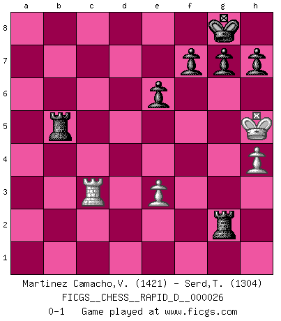 Last move : 0-1 2009 November 9 17:54:54 [Event "FICGS__CHESS__RAPID_D__000026"] [Site "FICGS"] [Date "2009.08.18"] [Round "1"] [White "Martinez Camacho,Victor Hugo"] [Black "Serd,Than"] [Result "0-1"] [WhiteElo "1421"] [BlackElo "1304"] 1.d4 d5 2.c4 c6 3.Nc3 Nf6 4.e3 e6 5.Nf3 Nbd7 6.Bd3 dxc4 7.Bxc4 b5 8.Bd3 Bb7 9.O-O a6 10.a3 c5 11.dxc5 Bxc5 12.b4 Be7 13.Re1 O-O 14.Bb2 Rc8 15.h3 Nb6 16.Bf1 Qc7 17.Rc1 Rfd8 18.Qb3 Qb8 19.a4 Nc4 20.Ba1 Qa8 21.Nd4 Nd2 22.Qa2 Nxf1 23.Rxf1 Bxg2 24.axb5 Bxf1 25.Rxf1 Bxb4 26.Nce2 axb5 27.Qxa8 Rxa8 28.Nxb5 Rd2 29.Ned4 R8a2 30.Kg2 Ne4 31.h4 Nxf2 32.Kf3 Nd1 33.Bc3 Bxc3 34.Nxc3 Nxc3 35.Rc1 Rf2+ 36.Kg4 Rg2+ 37.Kh5 Ra3 38.Nb5 Ra5 39.Rxc3 Rxb5+ 0-1 QGD Slav defense Kingside Castling by player White (move 9) Kingside Castling by player Black (move 13) Player Black won this chess game. Follow this game move after move (download)I believe that Chess possesses a magic that is also a help in advanced age. A rheumatic knee is forgotten during a game of Chess and other events can seem quite unimportant in comparison with a catastrophe on the chessboard. (Vlastimil Hort) Frage: Wie viele Autos haben Sie schon zerstört? - Antwort: Nur zwei. (Loek van Wely) Los problemas de Ajedrez exigen del compositor las mismas virtudes que caracterizan todo el arte de valor: originalidad, invención, concisión, armonía, complejidad e insinceridad explendida. (Vladimir Nabokov) Un journaliste : 'Vous préférez avoir une dame de plus sur l'échiquier ou au lit ?' Boris Spassky : 'Ca dépend de la position.' . 'gn is not allowed in chess unless n is an integer between 1 and 8 inclusive, where 1 and 8 are to interpreted as the standard numerals standing for integers in the ordered real-closed field R, with the *canonical* ordering. (As opposed to, say, an integer in the domain Z[2+i*sqrt(5)] or an integer in some exotic Grothendieck topos). (Normajean Yates)