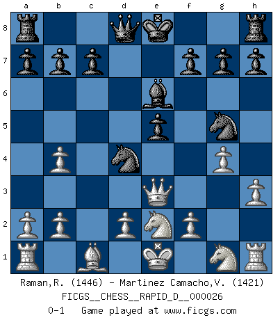 Last move : 0-1 2009 October 6 8:56:3 [Event "FICGS__CHESS__RAPID_D__000026"] [Site "FICGS"] [Date "2009.08.18"] [Round "1"] [White "Raman,Ranganathan"] [Black "Martinez Camacho,Victor Hugo"] [Result "0-1"] [WhiteElo "1446"] [BlackElo "1421"] 1.e4 e5 2.Nc3 Nf6 3.g4 Bb4 4.Bd3 d6 5.h3 Be6 6.Qf3 Nc6 7.Nce2 d5 8.c3 dxe4 9.Bxe4 Nxe4 10.cxb4 Ng5 11.Qe3 Nd4 0-1 This chess game has been lost on time (started : 2009.08.18 1:5:23) Vienna : Falkbeer variation Player Black won this chess game. Follow this game move after move (download)Fischer is completely natural. He plays no roles. He's like a child. Very, very simple. (Zita Rajcsanyi) Schach ist eine Sache der genauen Beurteilung, wann man zuschlagen und wann man sich ducken muss. (Robert James Fischer) El Ajedrez, como la música, como el amor, tiene el poder de hacer feliz a la gente. (Siegbert Tarrasch) Toutes les manuvres exécutées sur une colonne ouverte ont pour but ultime l'intrusion définitive sur la septième ou la huitième rangée, en plein cur de la position ennemie. (Aaron Nimzovitch) You cannot beat a roulette table unless you steal money from it. (Albert Einstein)