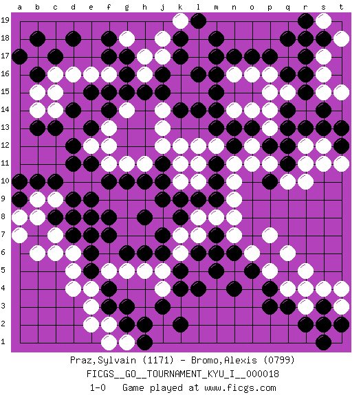 Last move : 1-0 2010 February 16 21:39:45 [Event "FICGS__GO__TOURNAMENT_KYU_I__000018"] [Site "FICGS"] [Date "2009.08.19"] [Round "1"] [Black "Praz,Sylvain"] [White "Bromo,Alexis"] [Result "1-0"] [Rating 1 "1171"] [Rating 2 "0799"] 1.r16 d4 2.q3 d16 3.f17 k16 4.d14 d10 5.f3 e3 6.f4 k10 7.k4 q10 8.d7 d6 9.e6 d5 10.e7 o14 11.p17 o6 12.n4 l5 13.l4 r5 14.g10 g8 15.e9 f11 16.e11 e12 17.d11 e10 18.f10 f9 19.f8 g9 20.d12 f12 21.l14 g11 22.h10 h9 23.j11 h11 24.j10 k12 25.j9 j8 26.k9 l8 27.e8 j12 28.k8 k7 29.j7 h7 30.h8 g7 31.j6 j8 32.l9 l10 33.m9 m8 34.m17 n9 35.m10 l11 36.m11 m12 37.n12 o12 38.n13 n11 39.m13 l12 40.c10 j5 41.k5 k6 42.h6 h5 43.g6 n10 44.h8 c7 45.c8 b8 46.b7 c6 47.m15 k11 48.f7 j4 49.k2 q4 50.p4 p5 51.p3 r3 52.h15 k15 53.k14 j14 54.j15 j13 55.f14 l15 56.m16 h16 57.g15 g14 58.f15 n14 59.m14 n16 60.n17 o16 61.o17 p16 62.q16 p15 63.r13 r12 64.s13 s12 65.t12 t11 66.t13 s11 67.o13 p13 68.p12 o11 69.q13 p14 70.q12 q15 71.r15 f16 72.g16 e16 73.g17 h17 74.j16 j17 75.k17 l17 76.k18 l18 77.m18 k19 78.l16 j18 79.l19 c9 80.d9 d8 81.c17 c16 82.d18 b17 83.b18 c14 84.b13 b14 85.c13 c15 86.b16 b15 87.a17 s17 88.r17 r18 89.q18 s16 90.s18 s19 91.r19 g18 92.f18 f2 93.g2 f5 94.e5 e4 95.g3 e2 96.p10 p11 97.q11 r10 98.c8 b9 99.b10 b6 100.l6 l7 101.m5 m6 102.n6 n7 103.m7 n8 104.o5 p7 105.r2 s2 106.s3 r4 107.t2 s4 108.s1 t4 109.m6 t3 110.s2 g5 111.j3 g1 112.h1 f1 113.h2 r14 114.s14 s15 115.q14 t18 116.r18 r11 117.a9 d8 118.p6 q6 119.c8 a7 120.d8 a8 121.a10 e14 122.e13 f13 123.e15 t15 124.pass 1-0 Here are the names of the openings (joseki) played in the four corners : Corner d16 : d16 f17 Hoshi (Hwajeom, Seongjeom, Xingwei`) 4-4 Point. The star or hoshi (4-4) point, emphasizing influence at the potential expense of territory. Ikken Kakari (Hankan Keolch'im, Yi Gua`jiao~, 1-Space Low Approach). Black 2 is the standard approach move to the 4-4. Corner d4 : d4 f3 Hoshi (Hwajeom, Seongjeom, Xingwei`) 4-4 Point. The star or hoshi (4-4) point, emphasizing influence at the potential expense of territory. Ikken Kakari (Hankan Keolch'im, Yi Gua`jiao~, 1-Space Low Approach). Black 2 is the standard approach move to the 4-4. Corner q16 : r16 o14 Komoku (Somok, Xiao~mu`) 3-4 Point. The komoku (3-4) point is the traditional corner enclosure move.. Corner q4 : q3 o6 Komoku (Somok, Xiao~mu`) 3-4 Point. The komoku (3-4) point is the traditional corner enclosure move.. Player Black won this Go (weiqi, baduk) game. Follow this game move after move (download)The carpenter's square becomes ko. (Anonymous) Opportunities multiply as they are seized. (Sun Tzu)