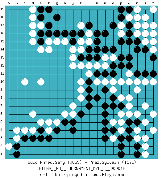 Last move : 0-1 2010 April 7 22:48:7 [Event "FICGS__GO__TOURNAMENT_KYU_I__000018"] [Site "FICGS"] [Date "2009.08.19"] [Round "1"] [Black "Ould Ahmed,Samy"] [White "Praz,Sylvain"] [Result "0-1"] [Rating 1 "0665"] [Rating 2 "1171"] 1.q16 d4 2.q4 d17 3.f3 d6 4.f17 d15 5.e16 d16 6.j4 r6 7.r5 q6 8.n4 q10 9.q13 c10 10.j16 e10 11.r11 r10 12.s11 g5 13.g4 f5 14.d3 c4 15.c3 g15 16.g16 h15 17.h16 k14 18.n16 l16 19.l17 f15 20.m16 l15 21.o14 m12 22.o12 n10 23.n6 j6 24.l7 k8 25.l8 k9 26.l9 k10 27.l10 l11 28.n11 o10 29.o8 q8 30.p9 p10 31.q9 r9 32.m11 s10 33.t11 r17 34.q17 r16 35.r15 s15 36.s14 k12 37.k6 j7 38.h5 h6 39.j5 s16 40.r14 q18 41.p18 r18 42.q19 t15 43.t17 s18 44.t18 r19 45.p19 p4 46.p3 o3 47.p2 o5 48.o4 p5 49.n5 r3 50.q3 s5 51.s4 r4 52.q5 s3 53.n3 p6 54.r2 s2 55.r1 b3 56.b2 b4 57.e4 e5 58.e15 e14 59.j15 j14 60.m14 n8 61.n7 o9 62.o7 p8 63.l13 l12 64.m8 f18 65.g18 e17 66.f16 f14 67.e18 d18 68.f19 n13 69.n14 o13 70.p13 f4 71.e3 t19 72.s19 t16 73.t19 a2 74.b1 s17 75.t18 t19 76.s19 k17 77.k16 t19 78.s6 t4 79.s19 p17 80.o17 t19 81.t5 t6 82.s19 p16 83.q15 t19 84.p15 t17 85.m13 n12 86.o11 q11 87.q12 m10 88.p12 t14 89.t13 d19 90.e19 t10 91.n9 s7 92.l14 k15 93.k13 j13 94.p7 s1 95.p1 q7 96.m15 j12 0-1 Here are the names of the openings (joseki) played in the four corners : Corner d4 : d4 f3 Hoshi (Hwajeom, Seongjeom, Xingwei`) 4-4 Point. The star or hoshi (4-4) point, emphasizing influence at the potential expense of territory. Ikken Kakari (Hankan Keolch'im, Yi Gua`jiao~, 1-Space Low Approach). Black 2 is the standard approach move to the 4-4. Corner d16 : d17 f17 Komoku (Somok, Xiao~mu`) 3-4 Point. The komoku (3-4) point is the traditional corner enclosure move.. Corner q4 : q4 r6 Hoshi (Hwajeom, Seongjeom, Xingwei`) 4-4 Point. The star or hoshi (4-4) point, emphasizing influence at the potential expense of territory. Ikken Kakari (Hankan Keolch'im, Yi Gua`jiao~, 1-Space Low Approach). White 2 is the standard approach move to the 4-4. Player White won this Go (weiqi, baduk) game. Follow this game move after move (download)Big groups never die. (Anonymous) In God we trust, all others we virus scan. (Anonymous)