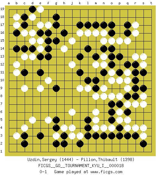 Last move : 0-1 2009 September 8 23:10:2 [Event "FICGS__GO__TOURNAMENT_KYU_I__000018 "] [Site "FICGS"] [Date "2009.08.19"] [Round "1"] [Black "Uzdin,Sergey "] [White "Pillon,Thibault "] [Result "0-1"] [Rating 1 "1444"] [Rating 2 "1398"] 1.q17 q4 2.e16 q15 3.o16 r17 4.q16 r16 5.r12 r13 6.q12 c4 7.e3 d5 8.h3 c9 9.o3 r7 10.r9 k16 11.m17 m16 12.l17 l16 13.k17 n16 14.n17 c16 15.d14 e17 16.f16 f17 17.c11 c13 18.c14 d13 19.e11 b11 20.e13 b12 21.g17 d16 22.g18 g16 23.l4 e15 24.f15 e14 25.f14 d15 26.f13 o15 27.r3 r4 28.q3 p8 29.q8 q7 30.p9 o8 31.h16 q10 32.r10 q9 33.r8 p10 34.o9 n9 35.p7 p6 36.o7 n8 37.o6 s8 38.s9 s7 39.p4 p5 40.o5 s3 41.s2 s4 42.o12 o11 43.o13 p15 44.o17 m12 45.n14 s12 46.s11 s13 47.l14 h14 48.k13 n13 49.o14 n15 50.m13 p12 51.p13 f5 52.k11 k9 53.l10 l9 54.m10 e9 55.m9 m8 56.g9 g3 57.g4 h4 58.g5 j4 59.g2 j3 60.h2 j6 61.c3 b3 62.c2 n4 63.n3 o4 64.p3 m4 65.m3 m5 66.l5 m6 67.k2 q11 68.p11 k3 69.r11 p12 70.q6 q5 71.p11 o10 72.l3 f10 73.b14 j15 74.g15 n12 75.n11 j12 76.d19 d18 77.b16 b17 78.c18 e19 79.c17 b18 0-1 Here are the names of the openings (joseki) played in the four corners : Corner q16 : q17 q15Komoku (Somok, Xiao~mu`) 3-4 Point. The komoku (3-4) point is the traditional corner enclosure move..Ikken Takagakari (Hankan Nop'dakeolch'im, Yi Gaogua`jiao~, 1-Space High Approach). The 5-4 approach move has become more popular in modern times, as modern Go emphasizes speed and influence. Corner d4 : c4 e3Komoku (Somok, Xiao~mu`) 3-4 Point. The komoku (3-4) point is the traditional corner enclosure move..Ikken Kakari (Hankan Keolch'im, Yi Gua`jiao~, 1-Space Low Pincer). The small knight move is the basic approach move to the 3-4 point stone. It has been continually used for over four centuries. There are limitless variations, with new moves constantly being discovered. Black 2 opens the door to a treaure store of joseki. Corner q4 : q4 o3Hoshi (Hwajeom, Seongjeom, Xingwei`) 4-4 Point. The star or hoshi (4-4) point, emphasizing influence at the potential expense of territory.Ikken Kakari (Hankan Keolch'im, Yi Gua`jiao~, 1-Space Low Approach). Black 2 is the standard approach move to the 4-4. Corner d16 : e16 c16Takamoku (Gomok, Gaomu`) 5-4 Point. The takamoku (high) point (5-4). With its emphasis on influence, the 5-4 point complements the 4-4 (hoshi) point in creating an influence-oriented fuseki.Komoku. Black responds with 3-3, 3-5, 4-6, 4-7, 3-6, 3-7. Player White won this Go (weiqi, baduk) game.Follow this game move after move (download ) When your opponent is thick, you must also become thick. (Otake Hideo, 9p) As a goal marker shodan is important. As a destination it is a poor place to stop. (Thomas Tamayo)