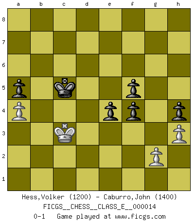 Last move : 0-1 2006 October 8 13:16:59 [Event "FICGS__CHESS__CLASS_E__000014"] [Site "FICGS"] [Date "2006.09.23"] [Round "1"] [White "Hess,Volker"] [Black "Caburro,John"] [Result "0-1"] [WhiteElo "1200"] [BlackElo "1400"] 1.e4 d5 2.exd5 Qxd5 3.Nc3 Qa5 4.Nf3 Nf6 5.Be2 Bf5 6.O-O e6 7.d4 c6 8.Bd2 Qc7 9.Re1 Bd6 10.Bg5 Nbd7 11.Bd3 Bxd3 12.Qxd3 O-O 13.Bxf6 Nxf6 14.Rad1 Rad8 15.Ne4 Nxe4 16.Rxe4 c5 17.Qc3 cxd4 18.Qxc7 Bxc7 19.Rexd4 Rxd4 20.Rxd4 Rd8 21.Rxd8+ Bxd8 22.Kf1 Bf6 23.b3 Kf8 24.Ke2 Ke7 25.Kd3 Kd6 26.Kc4 g6 27.Nd4 Bxd4 28.Kxd4 e5+ 29.Kc4 f5 30.a4 h6 31.b4 g5 32.Kd3 a6 33.c4 b6 34.f3 h5 35.h3 h4 36.Ke3 Kc6 37.Kf2 a5 38.bxa5 bxa5 39.Ke3 Kc5 40.Kd3 Kb4 41.c5 Kxc5 42.Kc3 e4 43.f4 gxf4 0-1 Scandinavian (centre counter) defense Kingside Castling by player White (move 6) Kingside Castling by player Black (move 12) 10 pieces endgame at move 43 : White KPPP , Black KPPPPP WHITE : King + 3 Pawns BLACK : King + 5 Pawns Player Black won this chess game. Follow this game move after move (download)Via the squares on the chessboard, the Indians explain the movement of time and the age, the higher influences which control the world and the ties which link Chess with the human soul. (Al-Masudi) Ich hatte Zahnschmerzen im ersten Spiel. In der zweiten Partie tat mir der Kopf weh. In der dritten war es eine Rheuma-Attacke und während der vierten fühlte ich mich nicht gut. Und in der fünften? Nun, man muss doch nicht jedes Spiel gewinnen, oder? (Savielly Grigorievitsch Tartakower) Me siento como si fuera una pieza en una partida de Ajedrez, cuando mi oponente me indica: esa pieza no puede ser movida. (Soren Kierkegaard) Ce qui caractérise les parties de combat, c'est que si le défenseur a constamment de difficiles problèmes à résoudre, l'attaquant doit chercher sans relâche de nouvelles possibilités d'attaque. (Koblentz) Gambling is the son of avarice and the father of despair. (French proverb)