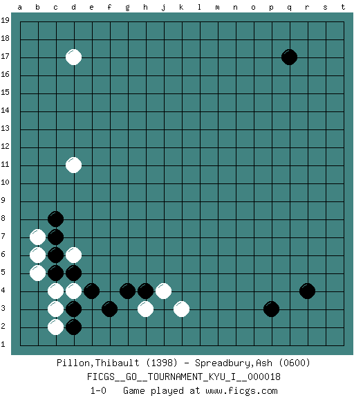 Last move : 1-0 2009 October 2 20:46:44 [Event "FICGS__GO__TOURNAMENT_KYU_I__000018"] [Site "FICGS"] [Date "2009.08.19"] [Round "1"] [Black "Pillon,Thibault"] [White "Spreadbury,Ash"] [Result "1-0"] [Rating 1 "1398"] [Rating 2 "0600"] 1.q17 d4 2.r4 d17 3.p3 d11 4.f3 h3 5.h4 j4 6.g4 k3 7.d2 c2 8.d3 c3 9.e4 d6 10.d5 c4 11.c5 b5 12.c6 b6 13.c7 b7 14.c8 1-0 This go game has been lost on time (started : 2009.08.19 10:3:28) Here are the names of the openings (joseki) played in the four corners : Corner d4 : d4 f3 Hoshi (Hwajeom, Seongjeom, Xingwei`) 4-4 Point. The star or hoshi (4-4) point, emphasizing influence at the potential expense of territory. Ikken Kakari (Hankan Keolch'im, Yi Gua`jiao~, 1-Space Low Approach). Black 2 is the standard approach move to the 4-4. Player Black won this Go (weiqi, baduk) game. Follow this game move after move (download)Be a little patient. Keshi works ! (Anonymous) There is far too much law for those who can afford it and far too little for those who cannot. (Derek Bok)
