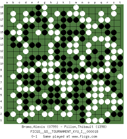 Last move : 0-1 2010 January 15 20:48:9 [Event "FICGS__GO__TOURNAMENT_KYU_I__000018"] [Site "FICGS"] [Date "2009.08.19"] [Round "1"] [Black "Bromo,Alexis"] [White "Pillon,Thibault"] [Result "0-1"] [Rating 1 "0799"] [Rating 2 "1398"] 1.q16 d17 2.d4 q4 3.k10 c11 4.k16 c6 5.k4 f3 6.e5 c3 7.d3 c4 8.c5 b5 9.d5 c7 10.c2 r14 11.r15 q14 12.s14 s13 13.s15 p14 14.n7 q7 15.p5 p4 16.o4 q5 17.r3 r4 18.q3 p3 19.p2 o2 20.q2 o3 21.n5 s3 22.s2 s4 23.r1 o17 24.p17 o16 25.q10 o8 26.p8 p7 27.n9 n8 28.o7 o9 29.o10 p9 30.q8 q9 31.r8 r9 32.f13 n10 33.m9 n11 34.o11 o12 35.p10 m12 36.f7 k2 37.r7 r6 38.s9 r10 39.q11 r11 40.p12 o13 41.e18 c15 42.d10 c10 43.o6 q6 44.s10 s11 45.t11 t12 46.t10 m8 47.l9 f5 48.f6 g5 49.h4 h2 50.s6 s5 51.t5 h7 52.h6 g6 53.g7 j7 54.j6 l7 55.m7 l8 56.l10 l4 57.l5 l3 58.k3 j3 59.j4 l6 60.m6 k5 61.m5 k6 62.m4 p6 63.n3 l2 64.m3 o5 65.n2 o1 66.p5 p1 67.t3 t4 68.t2 q1 69.s7 t8 70.n1 r2 71.d14 c14 72.c13 b2 73.d1 e2 74.f4 d2 75.g4 o5 76.k8 j8 77.j9 h9 78.h10 g9 79.f9 g10 80.g8 h8 81.f11 e3 82.g3 g2 83.a2 c1 84.e16 f10 85.e10 e9 86.e8 d9 87.d8 c9 88.c8 b8 89.d7 d6 90.h5 g5 91.p5 d18 92.d16 c16 93.d15 o5 94.g11 k7 95.r12 r13 96.j5 s12 97.p5 e6 98.e7 o5 99.b14 b15 100.b13 p5 101.m11 h11 102.j11 h12 103.j12 h13 104.j13 j10 105.k9 h10 106.k11 j14 107.k14 j15 108.k15 h16 109.j16 h15 110.g16 h17 111.g17 l13 112.k13 l12 113.l14 l18 114.k18 j18 115.k17 m18 116.l17 m16 117.m17 n17 118.o18 n18 119.n19 d12 120.e11 d13 121.e13 f15 122.g15 e17 123.f17 b18 124.a15 b17 125.m15 m14 126.n15 o15 127.n16 l16 128.l15 r17 129.r18 q18 130.p18 q17 131.q19 s18 132.r19 p19 133.o19 s19 134.p19 p16 135.r16 m19 136.n14 g18 137.f18 g19 138.f19 m13 0-1 Here are the names of the openings (joseki) played in the four corners : Corner d4 : d4 c6 Hoshi (Hwajeom, Seongjeom, Xingwei`) 4-4 Point. The star or hoshi (4-4) point, emphasizing influence at the potential expense of territory. Ikken Kakari (Hankan Keolch'im, Yi Gua`jiao~, 1-Space Low Approach). White 2 is the standard approach move to the 4-4. Corner q16 : q16 r14 Hoshi (Hwajeom, Seongjeom, Xingwei`) 4-4 Point. The star or hoshi (4-4) point, emphasizing influence at the potential expense of territory. Ikken Kakari (Hankan Keolch'im, Yi Gua`jiao~, 1-Space Low Approach). White 2 is the standard approach move to the 4-4. Corner q4 : q4 n7 Hoshi (Hwajeom, Seongjeom, Xingwei`) 4-4 Point. The star or hoshi (4-4) point, emphasizing influence at the potential expense of territory. Player White won this Go (weiqi, baduk) game. Follow this game move after move (download)The rectangular six is normally alive. (Anonymous) When the going gets tactical, the computers get going. (Hyatt)