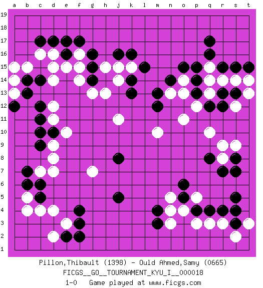 Last move : 1-0 2009 November 28 8:55:18 [Event "FICGS__GO__TOURNAMENT_KYU_I__000018 "] [Site "FICGS"] [Date "2009.08.19"] [Round "1"] [Black "Pillon,Thibault "] [White "Ould Ahmed,Samy "] [Result "1-0"] [Rating 1 "1398"] [Rating 2 "0665"] 1.q17 d4 2.r4 c16 3.e16 d14 4.c17 d16 5.d17 p3 6.m4 p5 7.r7 r3 8.q4 q3 9.p4 o4 10.o5 n5 11.o6 n4 12.f3 e3 13.f4 d7 14.k16 q15 15.p15 q13 16.p14 q14 17.q16 q10 18.d10 d11 19.c11 d12 20.c12 d9 21.c9 e10 22.c10 d8 23.b14 f14 24.g16 r8 25.q8 r9 26.r15 r14 27.s15 s14 28.b6 b4 29.c5 c4 30.m3 n3 31.j5 g7 32.e2 d2 33.f2 c7 34.b7 b5 35.c6 b15 36.c14 d15 37.s3 s2 38.s5 t3 39.s4 f15 40.g15 f16 41.f17 e15 42.e17 h13 43.k13 j11 44.p13 o11 45.j8 j14 46.k14 j15 47.j16 k15 48.l15 n13 49.n14 a14 50.b13 a13 51.a12 a15 52.m13 o13 53.m12 o14 54.o15 h15 55.g14 g13 56.s8 s9 57.s7 m10 58.q12 p12 59.r12 s12 60.s13 t13 61.r13 t14 62.t15 1-0 This go game has been lost on time (started : 2009.08.19 10:3:28) Here are the names of the openings (joseki) played in the four corners : Corner d16 : c16 e16Komoku (Somok, Xiao~mu`) 3-4 Point. The komoku (3-4) point is the traditional corner enclosure move..Ikken Takagakari (Hankan Nop'dakeolch'im, Yi Gaogua`jiao~, 1-Space High Approach). The 5-4 approach move has become more popular in modern times, as modern Go emphasizes speed and influence. Corner q4 : r4 p3Komoku (Somok, Xiao~mu`) 3-4 Point. The komoku (3-4) point is the traditional corner enclosure move..Ikken Kakari (Hankan Keolch'im, Yi Gua`jiao~, 1-Space Low Pincer). The small knight move is the basic approach move to the 3-4 point stone. It has been continually used for over four centuries. There are limitless variations, with new moves constantly being discovered. White 2 opens the door to a treaure store of joseki. Corner d4 : d4 f3Hoshi (Hwajeom, Seongjeom, Xingwei`) 4-4 Point. The star or hoshi (4-4) point, emphasizing influence at the potential expense of territory.Ikken Kakari (Hankan Keolch'im, Yi Gua`jiao~, 1-Space Low Approach). Black 2 is the standard approach move to the 4-4. Corner q16 : q17 q15Komoku (Somok, Xiao~mu`) 3-4 Point. The komoku (3-4) point is the traditional corner enclosure move..Ikken Takagakari (Hankan Nop'dakeolch'im, Yi Gaogua`jiao~, 1-Space High Approach). The 5-4 approach move has become more popular in modern times, as modern Go emphasizes speed and influence. Player Black won this Go (weiqi, baduk) game.Follow this game move after move (download ) To emphasize the lack of determination in his moves, one speaks of chance. (Pierre Audouard) Internet: Absolute communication, absolute isolation. (Paul Carvel)