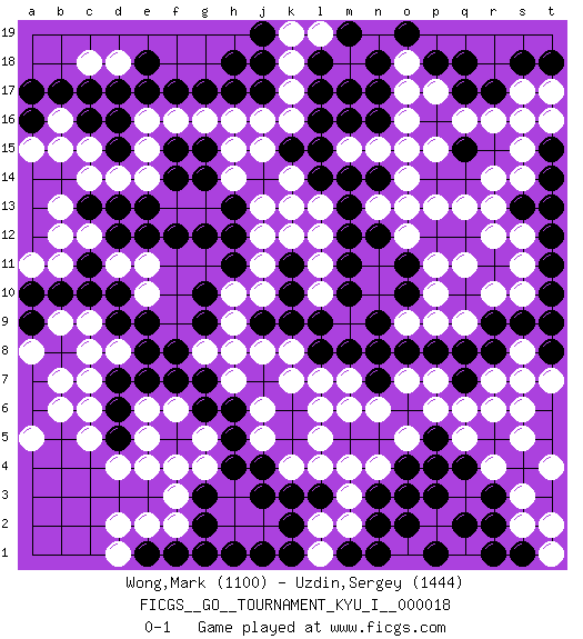 Last move : 0-1 2010 April 9 5:59:11 [Event "FICGS__GO__TOURNAMENT_KYU_I__000018"] [Site "FICGS"] [Date "2009.08.19"] [Round "1"] [Black "Wong,Mark"] [White "Uzdin,Sergey"] [Result "0-1"] [Rating 1 "1100"] [Rating 2 "1444"] 1.q17 c5 2.c16 r4 3.q15 e4 4.j17 j15 5.c10 g16 6.k15 k14 7.l14 k16 8.l15 j16 9.j14 k13 10.l16 k17 11.l17 k18 12.f17 m18 13.g17 e10 14.d12 c9 15.d9 c8 16.d10 h14 17.k3 o18 18.n17 r13 19.r11 p13 20.m12 o17 21.n18 n19 22.m17 o16 23.l18 o14 24.m19 p11 25.q12 q13 26.p12 o12 27.o11 p10 28.o10 p9 29.n12 o13 30.r9 r7 31.q8 o9 32.m10 p6 33.q7 q6 34.s7 s6 35.r8 r6 36.n8 s15 37.p18 s17 38.o19 r10 39.o8 r12 40.p8 q11 41.o3 h3 42.r2 n6 43.k5 l6 44.k6 l7 45.n9 s8 46.s9 k7 47.h6 m3 48.m4 n4 49.n3 l4 50.m5 l5 51.l3 m2 52.n5 o5 53.o4 k4 54.j3 l2 55.j4 j2 56.k2 h2 57.k1 j5 58.h5 j6 59.h4 q3 60.q2 e15 61.f14 f16 62.e17 c15 63.d15 d14 64.d16 e14 65.e8 p2 66.p3 m6 67.o2 n4 68.p1 h7 69.g3 f3 70.g2 f2 71.h1 f6 72.f5 f4 73.g6 e5 74.f7 e6 75.g7 h9 76.g10 j13 77.e13 b15 78.d7 c7 79.d6 c6 80.h8 b16 81.b17 j8 82.g9 g8 83.f8 j11 84.g12 b12 85.c13 c14 86.b10 b13 87.a7 b6 88.a6 a5 89.a9 d8 90.e7 t7 91.s4 s3 92.r3 s5 93.q4 t4 94.h18 s2 95.t12 s11 96.t11 l11 97.m11 s10 98.t10 t13 99.s13 s12 100.t14 t9 101.t8 e11 102.s7 d11 103.c11 c12 104.e12 r14 105.s16 r16 106.s18 q16 107.r17 t16 108.t18 s8 109.t9 n15 110.m14 b9 111.a10 a8 112.e9 b7 113.g14 p17 114.q18 p15 115.k9 h10 116.h12 h8 117.h13 s7 118.s1 t2 119.a16 a15 120.a17 e16 121.c17 h16 122.j18 k19 123.h11 j12 124.k10 j10 125.f1 e2 126.e1 d1 127.g1 d2 128.d5 d4 129.d13 l12 130.n2 d18 131.e18 c18 132.d17 l1 133.j19 l10 134.l9 b11 135.n1 q5 136.p4 n13 137.m13 s14 138.t13 g4 139.j1 g5 140.m1 m4 141.g15 a11 142.k11 q9 143.h17 h15 144.n16 o7 145.n7 p7 146.l8 m7 147.m8 m15 148.n14 t17 149.t15 s16 150.f12 l13 151.r1 k8 152.p5 l19 153.m16 o15 154.f15 k12 155.j9 t1 156.pass pass 157.pass pass 0-1 Here are the names of the openings (joseki) played in the four corners : Player White won this Go (weiqi, baduk) game. Follow this game move after move (download)There is death in the hane. (Anonymous) There are more things in heaven and earth than practically anywhere else. (Unknown)