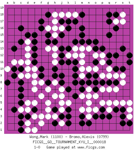 Last move : 1-0 2010 March 28 11:25:26 [Event "FICGS__GO__TOURNAMENT_KYU_I__000018"] [Site "FICGS"] [Date "2009.08.19"] [Round "1"] [Black "Wong,Mark"] [White "Bromo,Alexis"] [Result "1-0"] [Rating 1 "1100"] [Rating 2 "0799"] 1.q17 d4 2.c16 q4 3.q15 k10 4.k17 q10 5.k3 j4 6.k4 d10 7.o3 m4 8.o5 o4 9.p4 n4 10.q3 p5 11.p3 q5 12.r4 r5 13.s4 s5 14.m2 j2 15.j3 h3 16.k2 k5 17.h4 j5 18.h2 g3 19.r12 r11 20.q12 s12 21.s13 s11 22.o11 g13 23.j12 m11 24.o9 o10 25.p10 n10 26.q11 p9 27.r10 p11 28.s10 r9 29.t11 s9 30.t12 p12 31.f10 f8 32.h9 h11 33.j11 j10 34.h10 h12 35.j13 k12 36.k13 l13 37.l14 m12 38.k11 l12 39.l10 k9 40.l9 k8 41.l11 g4 42.e11 d11 43.e12 d12 44.e13 d13 45.e14 d14 46.d15 e10 47.f9 e9 48.n9 m9 49.m8 m10 50.l8 l7 51.o7 o6 52.n6 n5 53.l6 m6 54.k7 j7 55.m7 n7 56.n8 n6 57.j8 h8 58.h7 j6 59.g8 h6 60.p8 p7 61.q8 q9 62.o8 q7 63.r8 s8 64.f7 e8 65.g6 g5 66.c3 c4 67.d3 e3 68.e2 f2 69.e4 f3 70.b4 e5 71.c5 d5 72.c6 d2 73.c2 e1 74.c8 f6 75.e15 k14 76.m14 j14 77.h14 h13 78.g14 r7 79.j9 g7 80.p13 o12 81.o13 n13 82.n14 m13 83.b10 c9 84.b9 b11 85.c10 d9 86.c14 c11 87.b13 e7 88.c1 d1 89.c7 n3 90.n2 t4 91.s3 t3 92.t2 t5 93.s2 h8 94.m3 a10 95.a8 k15 96.k16 l15 97.o14 l16 98.l17 j16 99.j17 h16 100.m16 h17 101.f17 h15 102.g15 g16 103.f16 j18 104.m15 r17 105.r16 s17 106.r18 s18 107.q18 k18 108.g18 l18 109.j15 h18 110.m18 1-0 Here are the names of the openings (joseki) played in the four corners : Corner q4 : q4 o3 Hoshi (Hwajeom, Seongjeom, Xingwei`) 4-4 Point. The star or hoshi (4-4) point, emphasizing influence at the potential expense of territory. Ikken Kakari (Hankan Keolch'im, Yi Gua`jiao~, 1-Space Low Approach). Black 2 is the standard approach move to the 4-4. Corner d16 : c16 g13 Komoku (Somok, Xiao~mu`) 3-4 Point. The komoku (3-4) point is the traditional corner enclosure move.. Player Black won this Go (weiqi, baduk) game. Follow this game move after move (download)Keep away from thickness. (Anonymous) Do you know these so called Volunteers don't even get paid! (Simpsons)