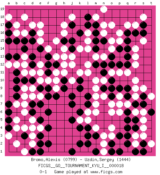 Last move : 0-1 2010 January 13 19:6:24 [Event "FICGS__GO__TOURNAMENT_KYU_I__000018"] [Site "FICGS"] [Date "2009.08.19"] [Round "1"] [Black "Bromo,Alexis"] [White "Uzdin,Sergey"] [Result "0-1"] [Rating 1 "0799"] [Rating 2 "1444"] 1.q16 d4 2.q4 d17 3.k10 r10 4.d10 r14 5.k4 r6 6.o8 o3 7.p3 o4 8.o2 s4 9.r5 s5 10.r4 r3 11.q3 r2 12.q2 o6 13.p7 p6 14.q6 m4 15.l3 m6 16.l7 l6 17.k6 k7 18.j7 k8 19.l8 n8 20.n9 m8 21.j8 m7 22.k9 o7 23.p9 q7 24.q5 p8 25.r7 s6 26.s7 r8 27.s8 s9 28.o12 o9 29.o10 n10 30.o8 m9 31.o9 m10 32.n11 p11 33.q9 r9 34.k16 o11 35.p12 q11 36.q12 r12 37.q8 p7 38.d16 c16 39.c15 e16 40.d15 b16 41.b15 e15 42.e14 c6 43.d7 c8 44.f4 d8 45.e7 e8 46.f8 l11 47.k12 l12 48.l13 r17 49.r16 q17 50.s17 p16 51.q15 p15 52.q14 n17 53.m17 n16 54.n15 s18 55.s16 c7 56.d6 d5 57.e5 h17 58.j17 h16 59.h15 e4 60.f6 e17 61.b9 e10 62.e9 d9 63.f9 d11 64.c10 c11 65.b11 e11 66.e3 d3 67.e2 d2 68.f2 b12 69.b8 c13 70.d13 b7 71.a7 r13 72.q13 g11 73.f11 f10 74.f12 g10 75.g12 k11 76.j11 h11 77.h10 h12 78.h13 j12 79.k13 j10 80.h9 g9 81.g8 j13 82.j14 g13 83.f13 h14 84.g14 h13 85.d12 c12 86.c14 g15 87.j15 f14 88.a16 b17 89.a6 b5 90.a5 b4 91.d1 c1 92.e1 b2 93.n12 n2 94.r1 l16 95.m16 l15 96.m15 m13 97.m12 k14 98.m14 l14 99.l17 n13 100.o13 o14 101.o16 o17 102.p14 o15 103.m3 n3 104.s2 s3 105.p1 t2 106.s1 k1 107.l2 l1 108.k2 s15 109.t6 t8 110.m1 n1 111.j1 m18 112.l18 n19 113.o1 k5 114.j5 l5 115.l4 j18 116.a17 a18 117.a15 c18 118.b13 a12 119.a13 e12 120.a4 c9 121.b10 a3 122.c3 c4 0-1 Here are the names of the openings (joseki) played in the four corners : Corner q16 : q16 r14 Hoshi (Hwajeom, Seongjeom, Xingwei`) 4-4 Point. The star or hoshi (4-4) point, emphasizing influence at the potential expense of territory. Ikken Kakari (Hankan Keolch'im, Yi Gua`jiao~, 1-Space Low Approach). White 2 is the standard approach move to the 4-4. Corner q4 : q4 r6 Hoshi (Hwajeom, Seongjeom, Xingwei`) 4-4 Point. The star or hoshi (4-4) point, emphasizing influence at the potential expense of territory. Ikken Kakari (Hankan Keolch'im, Yi Gua`jiao~, 1-Space Low Approach). White 2 is the standard approach move to the 4-4. Corner d4 : d4 j7 Hoshi (Hwajeom, Seongjeom, Xingwei`) 4-4 Point. The star or hoshi (4-4) point, emphasizing influence at the potential expense of territory. Corner d16 : d17 d16 Komoku (Somok, Xiao~mu`) 3-4 Point. The komoku (3-4) point is the traditional corner enclosure move.. Player White won this Go (weiqi, baduk) game. Follow this game move after move (download)If you don't know ladders, don't play go. (Anonymous) Don't be irreplaceable, if you can't be replaced, you can't be promoted. (Dan Rotaru)