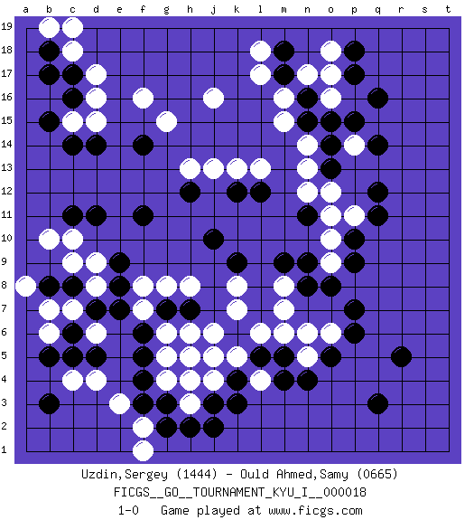 Last move : 1-0 2009 December 14 23:28:10 [Event "FICGS__GO__TOURNAMENT_KYU_I__000018"] [Site "FICGS"] [Date "2009.08.19"] [Round "1"] [Black "Uzdin,Sergey"] [White "Ould Ahmed,Samy"] [Result "1-0"] [Rating 1 "1444"] [Rating 2 "0665"] 1.q16 d4 2.q3 d16 3.f3 e3 4.f4 d6 5.r5 o17 6.p15 m16 7.p10 j16 8.l5 n14 9.p18 o18 10.p17 o12 11.q12 o10 12.p9 o9 13.f6 d9 14.c14 c15 15.d14 f16 16.c11 c10 17.d11 b10 18.c17 d17 19.b15 c18 20.c16 d15 21.b18 c19 22.o8 b19 23.b17 m8 24.n8 k8 25.n9 g8 26.f11 h6 27.h4 g5 28.f5 g4 29.g3 m6 30.m5 m7 31.j3 h5 32.m9 n6 33.o5 o6 34.p6 n5 35.n4 j4 36.k4 h3 37.h2 h4 38.j2 k5 39.k6 j5 40.h7 l4 41.k3 l6 42.m4 k7 43.p7 p11 44.q11 p14 45.q14 f2 46.g2 f1 47.g7 h8 48.j10 j13 49.k9 f7 50.e7 f8 51.e8 j6 52.e9 g6 53.h12 h13 54.f14 g15 55.k12 k13 56.l12 l13 57.n11 o11 58.o13 n13 59.o14 n12 60.n16 n17 61.n15 m15 62.m17 l17 63.m18 o16 64.o15 l18 65.c8 d8 66.d7 c7 67.c6 b7 68.b8 b6 69.c5 c9 70.b5 a8 71.d5 c4 72.b3 1-0 Here are the names of the openings (joseki) played in the four corners : Corner d4 : d4 f3 Hoshi (Hwajeom, Seongjeom, Xingwei`) 4-4 Point. The star or hoshi (4-4) point, emphasizing influence at the potential expense of territory. Ikken Kakari (Hankan Keolch'im, Yi Gua`jiao~, 1-Space Low Approach). Black 2 is the standard approach move to the 4-4. Corner q16 : q16 o17 Hoshi (Hwajeom, Seongjeom, Xingwei`) 4-4 Point. The star or hoshi (4-4) point, emphasizing influence at the potential expense of territory. Ikken Kakari (Hankan Keolch'im, Yi Gua`jiao~, 1-Space Low Approach). White 2 is the standard approach move to the 4-4. Player Black won this Go (weiqi, baduk) game. Follow this game move after move (download)You have to like to win, and to learn to recognize the errors that gave you the victory. (Pierre Audouard) A good teacher is like a candle - it consumes itself to light the way for others. (Author unknown)