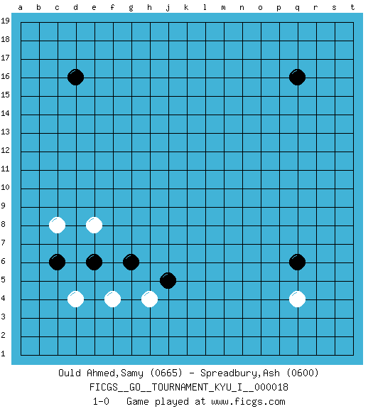 Last move : 1-0 2009 October 3 20:51:26 [Event "FICGS__GO__TOURNAMENT_KYU_I__000018 "] [Site "FICGS"] [Date "2009.08.19"] [Round "1"] [Black "Ould Ahmed,Samy "] [White "Spreadbury,Ash "] [Result "1-0"] [Rating 1 "0665"] [Rating 2 "0600"] 1.q16 d4 2.d16 q4 3.c6 c8 4.e6 f4 5.g6 e8 6.j5 h4 7.q6 1-0 This go game has been lost on time (started : 2009.08.19 10:3:28) Here are the names of the openings (joseki) played in the four corners : Corner d4 : d4 c6Hoshi (Hwajeom, Seongjeom, Xingwei`) 4-4 Point. The star or hoshi (4-4) point, emphasizing influence at the potential expense of territory.Ikken Kakari (Hankan Keolch'im, Yi Gua`jiao~, 1-Space Low Approach). Black 2 is the standard approach move to the 4-4. Corner q4 : q4 q6Hoshi (Hwajeom, Seongjeom, Xingwei`) 4-4 Point. The star or hoshi (4-4) point, emphasizing influence at the potential expense of territory.Ikken Takagakari (Hankan Nop'dakeolch'im, Yi Gaojia, 1-Space High Approach). White typically responds at 6-4 or 3-10. White 4-10 is played when White finds play on the right side advantageous. White 4-8 or 3-8 may be played when White has support at top. Player Black won this Go (weiqi, baduk) game.Follow this game move after move (download ) Keshi is worth as much as an invasion ! (Anonymous) The difference between perseverance and obstinacy is that one comes from a strong will, and the other from a strong won't. (Henry Ward Beecher)