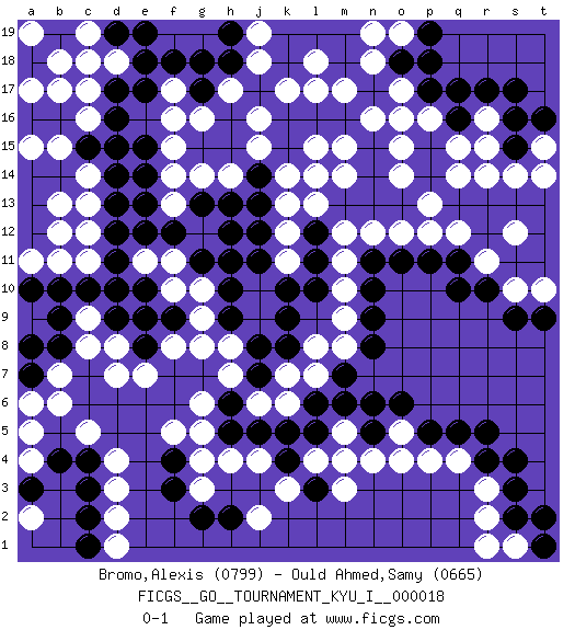Last move : 0-1 2010 June 20 11:12:50 [Event "FICGS__GO__TOURNAMENT_KYU_I__000018"] [Site "FICGS"] [Date "2009.08.19"] [Round "1"] [Black "Bromo,Alexis"] [White "Ould Ahmed,Samy"] [Result "0-1"] [Rating 1 "0799"] [Rating 2 "0665"] 1.q16 d4 2.d16 q4 3.k10 r14 4.q10 r16 5.r17 q15 6.s16 r15 7.s15 s14 8.s17 p16 9.q17 n16 10.k16 l17 11.d10 d7 12.k4 n4 13.o6 o5 14.p5 p4 15.q5 g4 16.n5 o4 17.m4 m3 18.m6 l4 19.l3 m5 20.n6 k3 21.l5 m4 22.k5 j4 23.j5 h4 24.h5 r11 25.r10 c9 26.c10 f8 27.e9 g9 28.h10 g10 29.g11 k17 30.j17 j18 31.h18 j19 32.h19 l18 33.l16 m14 34.m16 m17 35.p17 o17 36.o18 n18 37.p18 k14 38.p15 o16 39.n15 o15 40.p14 m15 41.n14 o14 42.n13 p13 43.o13 q14 44.l14 l15 45.k15 l13 46.m13 l14 47.l12 k12 48.j14 k13 49.j13 m12 50.l11 o12 51.p11 k11 52.j11 n12 53.n11 m11 54.l10 m10 55.n10 m9 56.n9 h17 57.g17 j16 58.b9 c8 59.b8 b7 60.b10 c17 61.d17 c16 62.c18 b18 63.c15 d18 64.b16 c19 65.e18 g16 66.g18 j15 67.j12 f17 68.f18 f16 69.e17 b17 70.a16 a17 71.e19 a19 72.d19 c18 73.r4 r3 74.r5 b15 75.b14 a15 76.a14 c14 77.d15 b13 78.d14 c13 79.d13 f14 80.e13 f11 81.f12 g12 82.h11 f13 83.e12 e11 84.d11 f10 85.h9 h8 86.j8 h7 87.j7 g5 88.h6 g6 89.e8 e7 90.e10 c12 91.d12 b11 92.a7 a6 93.a8 b6 94.a10 a11 95.a12 c11 96.f9 g8 97.s3 r2 98.s2 s1 99.s4 m8 100.n8 l7 101.m7 l8 102.k9 k6 103.l6 k7 104.k8 j6 105.g13 g14 106.h12 h14 107.h13 s10 108.s9 t10 109.t9 s12 110.q11 q12 111.o11 p12 112.t2 r1 113.t1 o19 114.p19 n19 115.c3 d3 116.c2 d2 117.c1 d1 118.c4 c5 119.b4 a4 120.a3 a5 121.a13 b12 122.g2 a2 123.e15 f15 124.e14 d8 125.d9 t15 126.t16 t14 127.h2 j2 128.f3 g3 129.f4 f5 0-1 Here are the names of the openings (joseki) played in the four corners : Corner q16 : q16 r14 Hoshi (Hwajeom, Seongjeom, Xingwei`) 4-4 Point. The star or hoshi (4-4) point, emphasizing influence at the potential expense of territory. Ikken Kakari (Hankan Keolch'im, Yi Gua`jiao~, 1-Space Low Approach). White 2 is the standard approach move to the 4-4. Player White won this Go (weiqi, baduk) game. Follow this game move after move (download)Five groups might live but the six will die. (Anonymous) It's not enough to succeed. Others must fail. (Gore Vidal)
