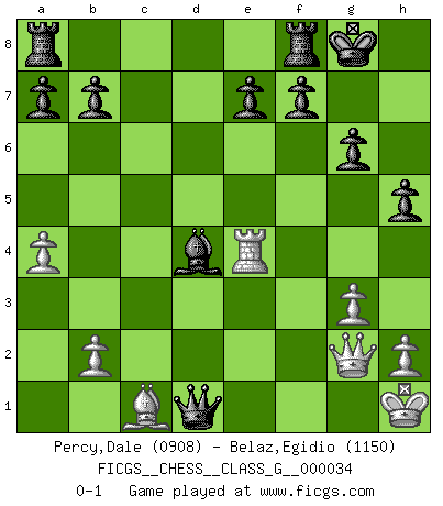 Last move : 0-1 2010 January 5 20:26:32 [Event "FICGS__CHESS__CLASS_G__000034"] [Site "FICGS"] [Date "2009.08.19"] [Round "1"] [White "Percy,Dale"] [Black "Belaz,Egidio"] [Result "0-1"] [WhiteElo "0908"] [BlackElo "1150"] 1.e4 c5 2.Nc3 d6 3.Bb5+ Bd7 4.Nf3 Nf6 5.d3 g6 6.e5 dxe5 7.Nxe5 Bxb5 8.Nxb5 Qa5+ 9.c3 Qxb5 10.O-O Bg7 11.a4 Qb6 12.Nf3 O-O 13.Ne5 Nc6 14.Ra3 Nxe5 15.d4 Nc4 16.Rb3 Qc7 17.g3 Ne4 18.Qg4 Nf6 19.Qh4 cxd4 20.cxd4 Nd6 21.Re1 Qc2 22.Rbe3 Nfe4 23.Qg4 Qxf2+ 24.Kh1 h5 25.Qh3 Bxd4 26.R1e2 Qf6 27.Rxe4 Nxe4 28.Rxe4 Qf3+ 29.Qg2 Qd1+ 0-1 This chess game has been lost on time (started : 2009.08.19 14:45:3) Sicilian : Closed Kingside Castling by player White (move 10) Kingside Castling by player Black (move 12) Player Black won this chess game. Follow this game move after move (download)No price is too great for the scalp of the enemy King. (Koblentz) Gewinnen beim Schach fördert das Selbstvertrauen. Beim Sex spüre ich sowas nicht... (Garry Kasparov) El Ajedrez, como cualquier otra actividad creativa, puede existir solo a través de méritos combinados de aquellos que tienen talento creativo y de aquellos que tienen la habilidad de organizar un trabajo creativo. (Mikhail Botvinnik) On croit qu'il y a plus de mauvais joueurs que de bons joueurs, c'est faux : Il y a autant de joueurs qui gagnent que de joueurs qui perdent. (Philippe Geluck) When you stop learning you start dying. (Scott Adams)