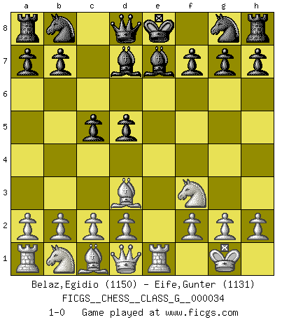 Last move : 1-0 2009 October 2 20:46:44 [Event "FICGS__CHESS__CLASS_G__000034"] [Site "FICGS"] [Date "2009.08.19"] [Round "1"] [White "Belaz,Egidio"] [Black "Eife,Gunter"] [Result "1-0"] [WhiteElo "1150"] [BlackElo "1131"] 1.e4 c5 2.Nf3 d6 3.Bc4 e6 4.O-O d5 5.exd5 exd5 6.Bb5+ Bd7 7.Re1+ Be7 8.Bd3 1-0 This chess game has been lost on time (started : 2009.08.19 14:45:3) Sicilian Kingside Castling by player White (move 4) Player White won this chess game. Follow this game move after move (download)I thought the most common mistake [in chess] was the first one: Learning the game :P (Garvin Gray, FICGS forum) Wie, soll nun auch die Opposition abgeschafft werden? Ja, es tut mir leid, Ihnen diesen Schmerz nicht ersparen zu können. (Aaron Nimzowitsch) Cuando tu casa esta en llamas, no puedes ser molestado por tus vecinos. O, como decinos en Ajedrez, si tu Rey esta bajo ataque, no te preocupa perder un Peón del lado de la Reina. (Gary Kasparov) A chaque perte on perd un peu de soi. (Joël Lautier) Man is still the most extraordinary computer of all. (John F. Kennedy)