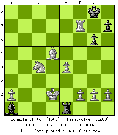Last move : 1-0 2006 October 3 20:5:17 [Event "FICGS__CHESS__CLASS_E__000014"] [Site "FICGS"] [Date "2006.09.23"] [Round "1"] [White "Schellen,Anton"] [Black "Hess,Volker"] [Result "1-0"] [WhiteElo "1600"] [BlackElo "1200"] 1.b4 e5 2.Bb2 Bxb4 3.Bxe5 Nf6 4.e3 Nc6 5.Bb2 O-O 6.Nf3 d6 7.Be2 d5 8.O-O Bg4 9.d3 Be7 10.Nbd2 Re8 11.c4 dxc4 12.Nxc4 Bxf3 13.Bxf3 Qd7 14.Rb1 Rad8 15.Bxf6 Bxf6 16.Rxb7 Qxd3 17.Qxd3 Rxd3 18.Bxc6 Red8 19.e4 Rd1 20.Rxc7 Rxf1+ 21.Kxf1 g6 22.Bd5 Bc3 23.Rxa7 Rb8 24.Rxf7 Rb1+ 25.Ke2 Re1+ 26.Kd3 Ba1 27.Kd2 1-0 Polish (Sokolsky) opening Kingside Castling by player Black (move 5) Kingside Castling by player White (move 8) Player White won this chess game. Follow this game move after move (download)The Pawns are the soul of the game. (Francois Andre Danican Philidor) Ich möchte Schüler heranbilden, die das Vermögen haben, selbst zu denken und Kritik zu üben. (Emanuel Lasker) El Rey es una pieza de pelea. ¡Usenlo!. (Wilhelm Steinitz) Il (Jacob Murray) ne joue pas pour le bon coup, mais pour le meilleur. (Eloi Relange) Life doesn't imitate art, it imitates bad television. (Woody Allen)