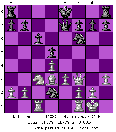 Last move : 0-1 2009 August 31 17:54:53 [Event "FICGS__CHESS__CLASS_G__000034"] [Site "FICGS"] [Date "2009.08.19"] [Round "1"] [White "Neil,Charlie"] [Black "Harper,Dave"] [Result "0-1"] [WhiteElo "1102"] [BlackElo "1154"] 1.d4 Nf6 2.c4 d5 3.Nc3 e6 4.Bg5 Nbd7 5.e3 c6 6.cxd5 exd5 7.Nf3 Be7 8.Bd3 Ne4 9.Bxe7 Qxe7 10.O-O Ndf6 11.Rc1 Bg4 12.h3 Bxf3 13.Qxf3 Nd2 0-1 Queen's pawn game Kingside Castling by player White (move 10) Player Black won this chess game. Follow this game move after move (download)Life is like a game of Chess, changing with each move. (Chinese proverb) Computer sind die einzigen Gegner, die nicht immer eine Ausrede auf Lager haben, wenn sie gegen mich verlieren. (Robert James Fischer) Fischer es una tragedia del Ajedrez Americano a la par con Morphy y Pillsbury. (Mig Greengard) Même si vous avez un bon coup à faire, regardez toujours s'il n'y en a pas un qui lui soit préférable. (Pedro Damiano) Animated gif is worth one mega-word. (Unknown)