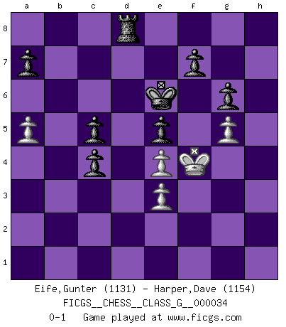 Last move : 0-1 2009 December 6 11:34:42 [Event "FICGS__CHESS__CLASS_G__000034"] [Site "FICGS"] [Date "2009.08.19"] [Round "1"] [White "Eife,Gunter"] [Black "Harper,Dave"] [Result "0-1"] [WhiteElo "1131"] [BlackElo "1154"] 1.e4 e5 2.Nf3 Nc6 3.d3 Nf6 4.c4 Be7 5.Be2 d6 6.Be3 O-O 7.O-O Be6 8.Nc3 Nd7 9.d4 exd4 10.Nxd4 Nxd4 11.Bxd4 c5 12.Be3 Nb6 13.a4 Nxc4 14.b3 Nxe3 15.fxe3 Bf6 16.Rc1 Bxc3 17.Rxc3 Qa5 18.Qd2 Bxb3 19.Bd1 Bxd1 20.Rxd1 Rad8 21.Rc4 Qxd2 22.Rxd2 g6 23.Kf2 Kg7 24.g4 Rfe8 25.Kf3 Re5 26.Kf4 Kf6 27.h4 h6 28.a5 b5 29.Rd5 bxc4 30.g5+ hxg5+ 31.hxg5+ Ke6 32.Rxe5+ dxe5+ 0-1 King's pawn game Kingside Castling by player Black (move 6) Kingside Castling by player White (move 7) Player Black won this chess game. Follow this game move after move (download)Bobby Fischer's current state of mind is indeed a tragedy. One of the world's greatest Chess players - the pride and sorrow of American Chess. (Frank Brady) Je älter ich werde, um so mehr schätze ich die Bauern. (Paul Keres) Botvinnik trataba de restarle el misterio al Ajedrez, siempre relacionandolo a situaciones de la vida ordinaria. El gustaba de llamar al Ajedrez un típico problema inexacto similar a aquellos de los cuales la gente siempre tiene que enfrentarse en la vida cotidiana. (Garry Kasparov) Mon pion favori sur ma case favorite ! Bronstein en parlant d'un coup de pion en h5 quand il avait les Noirs. I find your interest interesting. (Gregory House, House M.D.)