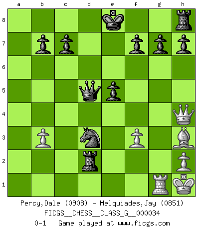Last move : 0-1 2009 December 19 7:52:1 [Event "FICGS__CHESS__CLASS_G__000034"] [Site "FICGS"] [Date "2009.08.19"] [Round "1"] [White "Percy,Dale"] [Black "Melquiades,Jay"] [Result "0-1"] [WhiteElo "0908"] [BlackElo "0851"] 1.e4 e5 2.Nf3 Nc6 3.d3 Nf6 4.Nc3 Bb4 5.Qd2 d5 6.b3 Bg4 7.Bb2 Bxf3 8.gxf3 dxe4 9.O-O-O a5 10.Re1 Nd4 11.fxe4 Nf3 12.Qe3 Bxc3 13.Bxc3 Nxe1 14.Qxe1 Nd7 15.Bh3 Qg5+ 16.Bd2 Qe7 17.Rg1 a4 18.d4 axb3 19.cxb3 Qa3+ 20.Kb1 Qxa2+ 21.Kc1 Qa1+ 22.Kc2 Ra2+ 23.Kd3 Qxd4+ 24.Ke2 Qxe4+ 25.Kf1 Qd3+ 26.Kg2 Qd5+ 27.f3 Nc5 28.Kh1 Nd3 29.Qh4 Rxd2 0-1 This chess game has been lost on time (started : 2009.08.19 14:45:3) King's pawn game Queenside Castling by player White (move 9) Player Black won this chess game. Follow this game move after move (download)Suddenly it was obvious to me in my analysis I had missed what Fischer had found with the greatest of ease at the board. (Mikhail Botvinnik) Matt entspricht nicht immer den Tatsachen. (Savielly Grigorievitsch Tartakower) Una victoria por una combinación errónea, aunque sea espectacular, me llena de horror artístico. (Wilhelm Steinitz) Dieu déplace le joueur, et celui-ci la pièce. Quel Dieu derrière Dieu commence donc la trame ? Arturo Perez-Reverte (prix de littérature policière 1993). The intuitive mind is a sacred gift; the rational mind is a faithful servant. We have created a society that honors the servant but has forgotten the gift. (Albert Einstein)