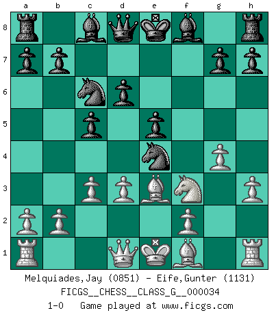 Last move : 1-0 2009 September 29 22:11:9 [Event "FICGS__CHESS__CLASS_G__000034"] [Site "FICGS"] [Date "2009.08.19"] [Round "1"] [White "Melquiades,Jay"] [Black "Eife,Gunter"] [Result "1-0"] [WhiteElo "0851"] [BlackElo "1131"] 1.e4 c5 2.Nf3 d6 3.c3 e5 4.h3 f5 5.d3 Nf6 6.Nbd2 Nc6 7.g4 fxe4 8.Nxe4 Nxe4 9.Be3 1-0 This chess game has been lost on time (started : 2009.08.19 14:45:3) Sicilian Player White won this chess game. Follow this game move after move (download)Chess is above all, a fight ! (Emanuel Lasker) Dieses schreckliche Gefühl, dass ich gegen eine Maschine spielte, die niemals Fehler macht, zerschmetterte meinen Widerstand. (Mark Taimanov) Solo los afeminados hacen el Enroque. (Rob Sillars) Votre seul travail dans les ouvertures est d'obtenir un milieu de partie jouable. (Lajos Portish) Some people are so afraid to die that they never begin to live. (Henry Van Dyke)