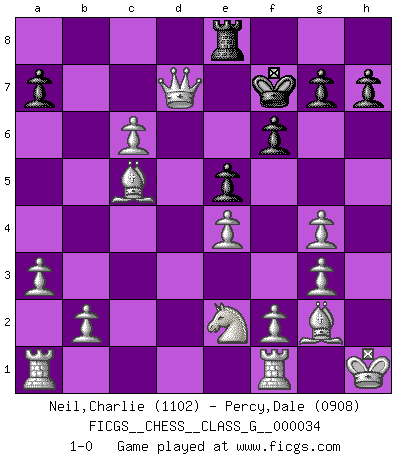 Last move : 1-0 2010 January 21 3:27:17 [Event "FICGS__CHESS__CLASS_G__000034"] [Site "FICGS"] [Date "2009.08.19"] [Round "1"] [White "Neil,Charlie"] [Black "Percy,Dale"] [Result "1-0"] [WhiteElo "1102"] [BlackElo "0908"] 1.c4 e5 2.g3 Nf6 3.Bg2 Bc5 4.Nc3 O-O 5.d3 Ng4 6.e3 Nc6 7.Qxg4 d6 8.Qd1 Nb4 9.Nge2 Re8 10.O-O Bf5 11.e4 Bg4 12.Kh1 Nc6 13.h3 Qg5 14.hxg4 Ne7 15.Bxg5 Ng6 16.Nd5 c6 17.Nc7 Rad8 18.Nxe8 Rxe8 19.a3 b6 20.d4 d5 21.dxc5 bxc5 22.cxd5 f6 23.Be3 Ne7 24.Bxc5 Nc8 25.dxc6 Re6 26.Qd8+ Kf7 27.Qxc8 Re8 28.Qd7+ 1-0 English Opening Kingside Castling by player Black (move 4) Kingside Castling by player White (move 10) Player White won this chess game. Follow this game move after move (download)I'm not a materialistic person, in that, I don't suffer the lack or loss of money. The absence of worldly goods I don't look back on. For Chess is a way I can be as materialistic as I want without having to sell my soul. (Jamie Walter Adams) Die meiste Zeit treffe ich auf Gegner, die meine Enkel sein könnten. Ich bin da, um ihnen zu zeigen, dass sie von mir noch einiges lernen können. (Viktor Kortschnoi) En posiciones complicadas, Bobby Fischer pocas veces tuvo que temer de cualquiera. (Paul Keres) Les échecs c'est le défi de l'alpiniste, toujours plus haut, prêt à tout pour monter à l'assaut du Roi ennemi. Les échecs, c'est de la musique en mouvement, un ballet majestueux pour les yeux. C'est de la poésie composée par les fantômes du passé qui au même titre que Rimbaud ou Verlaine méritent notre admiration. Les échecs, c'est de la peinture ou le moindre mouvement modifie le tableau pour en faire un Picasso ou un Van Gogh. Les échecs, c'est tout et rien, c'est la vie et la mort. Jjulie33 sur le forum de France-Echecs. The bottom line is always the bottom line. (Johann Piek)