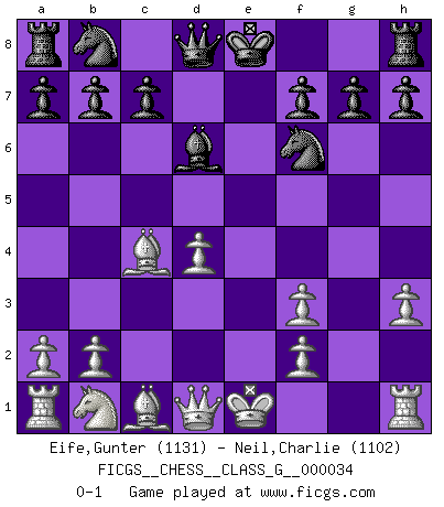 Last move : 0-1 2009 October 3 8:48:19 [Event "FICGS__CHESS__CLASS_G__000034"] [Site "FICGS"] [Date "2009.08.19"] [Round "1"] [White "Eife,Gunter"] [Black "Neil,Charlie"] [Result "0-1"] [WhiteElo "1131"] [BlackElo "1102"] 1.e4 e6 2.d4 d5 3.exd5 exd5 4.c4 dxc4 5.Bxc4 Nf6 6.Nf3 Bg4 7.h3 Bxf3 8.gxf3 Bd6 0-1 This chess game has been lost on time (started : 2009.08.19 14:45:3) French : Exchange variation Player Black won this chess game. Follow this game move after move (download)Nonsense was the last thing Fischer was interested in, as far as Chess was concerned. (Elie Agur) Sie führen leise Selbstgespräche, schlürfen lautstark ihre Getränke, schmatzen hörbar beim Essen, blasen ihrem Gegenüber Rauch in die Augen, niesen ihm ins Gesicht, starren ihn unverwandt an, bis er sich unter ihren Blicken windet, rutschen ständig auf ihrem Stuhl hin und her, rülpsen und bohren in der Nase. (Anonymous) Es muy difícil jugar en contra de la teoría de Einstein. - en su primera derrota en contra de Fischer (Mikhail Tal) Les Echecs sont et restent toujours un combat, un combat intégral comme la boxe, la lutte ou un autre sport, et où il doit y avoir un vainqueur et un vaincu. (Joseph Emil Diemer) 98% of all statistics are made up. (Author unknown)