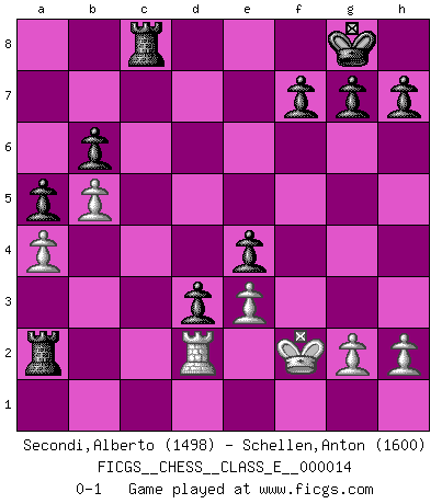 Last move : 0-1 2006 December 6 7:29:56 [Event "FICGS__CHESS__CLASS_E__000014"] [Site "FICGS"] [Date "2006.09.23"] [Round "1"] [White "Secondi,Alberto"] [Black "Schellen,Anton"] [Result "0-1"] [WhiteElo "1498"] [BlackElo "1600"] 1.d4 d5 2.Nc3 Bf5 3.Nf3 c6 4.Bf4 e6 5.e3 Bd6 6.Bxd6 Qxd6 7.Bd3 Bxd3 8.Qxd3 Nf6 9.O-O O-O 10.a3 Nbd7 11.b4 a5 12.Rfb1 b6 13.b5 c5 14.e4 cxd4 15.Qxd4 e5 16.Qd3 Nc5 17.Qe2 d4 18.Nd1 Nfxe4 19.Nd2 Nxd2 20.Qxd2 Rac8 21.c3 Ne4 22.Qd3 Nxc3 23.Rc1 e4 24.Qd2 Nxd1 25.Rxd1 d3 26.Ra2 Rc5 27.a4 Qd4 28.Qe3 Qxe3 29.fxe3 Rfc8 30.R1d2 Rc2 31.Kf2 Rxa2 0-1 Queen's pawn : Chigorin variation Kingside Castling by player White (move 9) Kingside Castling by player Black (move 9) Player Black won this chess game. Follow this game move after move (download)The older I grow, the more I value pawns. (Paul Keres) Die starken Figuren des Gegners muss man abtauschen. (José Raúl Capablanca) Ciertamente el estado mental actual de Bobby Fischer es una tragedia. Uno de los mas grandes jugadores de Ajedrez del mundo -el orgullo y pena del Ajedrez Americano. (Frank Brady) Botvinnik disait en comparant les échecs à la musique: Il existe une science dont le but est l'étude de l'acoustique et des sons. Mais il y a aussi un art qui se sert de l'océan des sons : c'est la musique. De toute évidence, il en est de même pour la pensée. La logique est l'étude des lois de la réflexion et les échecs reflètent, en tant qu'art, le côté logique de la réflexion, sous la forme d'images artistiques... Extrait de Fischer - Spassky, Reykjavik 1972 par Alexander & F. Wyndham (Ed. Solar), p 37. Somewhere in the world there is an epigram for every dilemma. (Hendrik Willem van Loon)