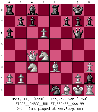 Last move : 0-1 2010 April 12 2:58:42 [Event "FICGS__CHESS__BULLET_BRONZE__000199"] [Site "FICGS"] [Date "2010.04.12"] [Round "1"] [White "Bori,Aliyu"] [Black "Trajkov,Ivan"] [Result "0-1"] [WhiteElo "0958"] [BlackElo "1750"] 1.d4 d5 2.e3 Nf6 3.f3 e6 4.c3 Nc6 5.Qd3 Be7 6.c4 O-O 7.cxd5 exd5 8.Nc3 Be6 9.Nge2 a6 10.e4 dxe4 11.fxe4 Nb4 12.Qe3 Ng4 13.Qf4 Nc2+ 14.Kd1 Nxa1 15.d5 Bc8 16.h3 Bd6 17.e5 Bxe5 18.Qc4 Nf2+ 19.Kd2 Qg5+ 20.Ke1 Nc2+ 21.Kxf2 Qf5+ 22.Kg1 Ne1 23.Be3 Re8 24.Nd4 Qg6 25.d6 Bh2+ 0-1 Queen's pawn game Kingside Castling by player Black (move 6) Player Black won this chess game. Follow this game move after move (download)Chess is the art which expresses the science of logic. (Mikhail Botvinnik) Ich glaube nicht an Psychologie, ich glaube an gute Züge. (Robert James Fischer) Por esta medida (el intervalo entre Fischer y sus contemporaneos), yo le considero el mas grande campeón mundial. (Garry Kasparov) Aucun coup ne doit être joué sans but. (Pedro Damiano) When it is a question of money, everybody is of the same religion. (Voltaire)