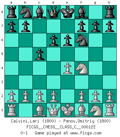 Last move : 0-1 2009 October 3 20:51:26 [Event "FICGS__CHESS__CLASS_C__000122"] [Site "FICGS"] [Date "2009.08.21"] [Round "1"] [White "Calvini,Lari"] [Black "Panov,Dmitriy"] [Result "0-1"] [WhiteElo "1800"] [BlackElo "1800"] 1.e4 c5 2.Nc3 d6 3.Nd5 e6 4.Nf4 Nf6 0-1 This chess game has been lost on time (started : 2009.08.21 20:20:6) Sicilian : Closed Player Black won this chess game. Follow this game move after move (download)If your opponent cannot do anything active, then don't rush the position; instead you should let him sit there, suffer, and beg you for a draw. (Jeremy Silman) Die Elozahlen sind sehr schlecht für das Schach. Jetzt ist Schach eine Sportindustrie, die darauf zielt Elopunkte zu machen. (Miguel Najdorf) Haz el enroque temprano y seguido. (Rob Sillars) Les échecs sont utiles à l'exercice de la faculté de penser et à celle de l'imagination. Car nous devons posséder une méthode élaborée pour atteindre des buts partout où nous devons conduire notre raison. (Leibnitz) It's not enough to succeed. Others must fail. (Gore Vidal)